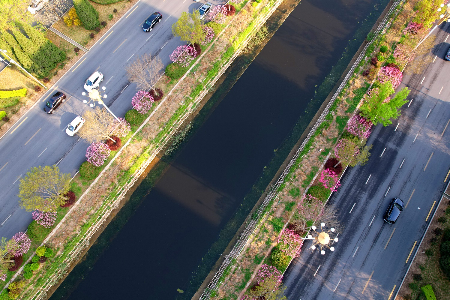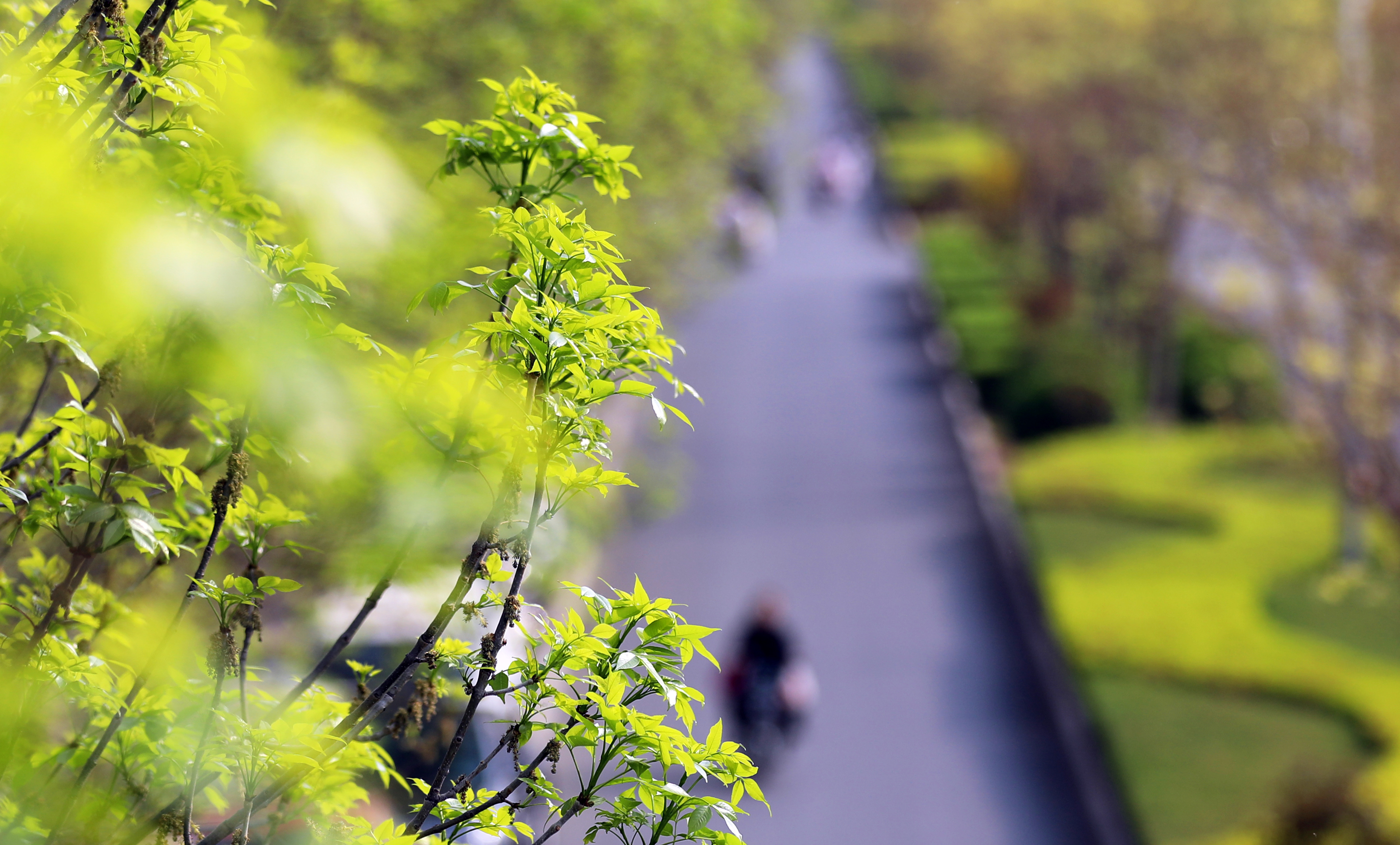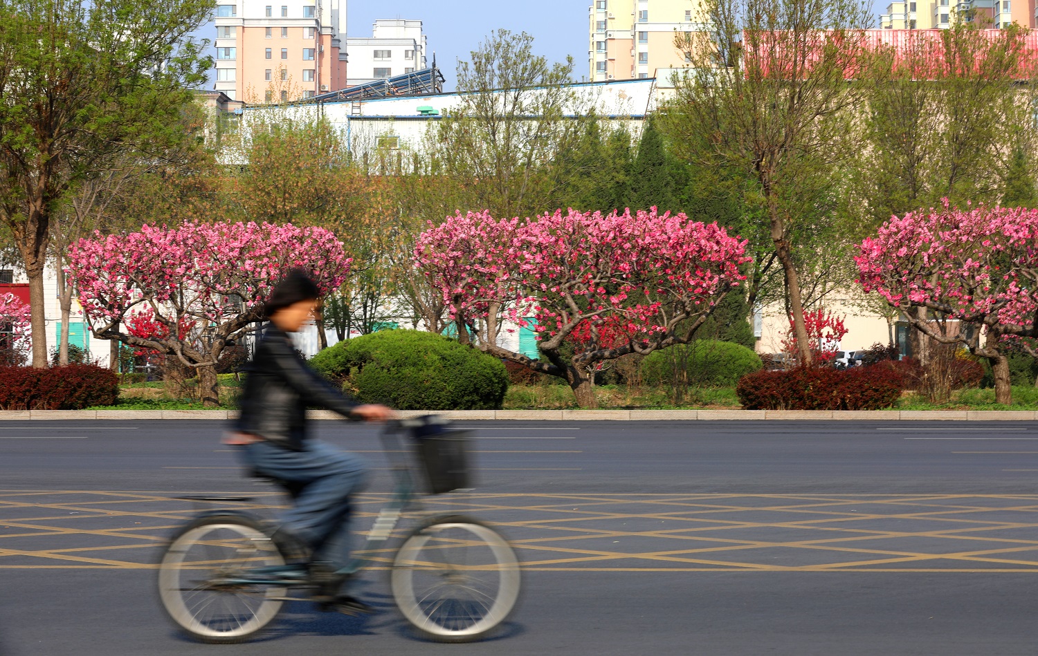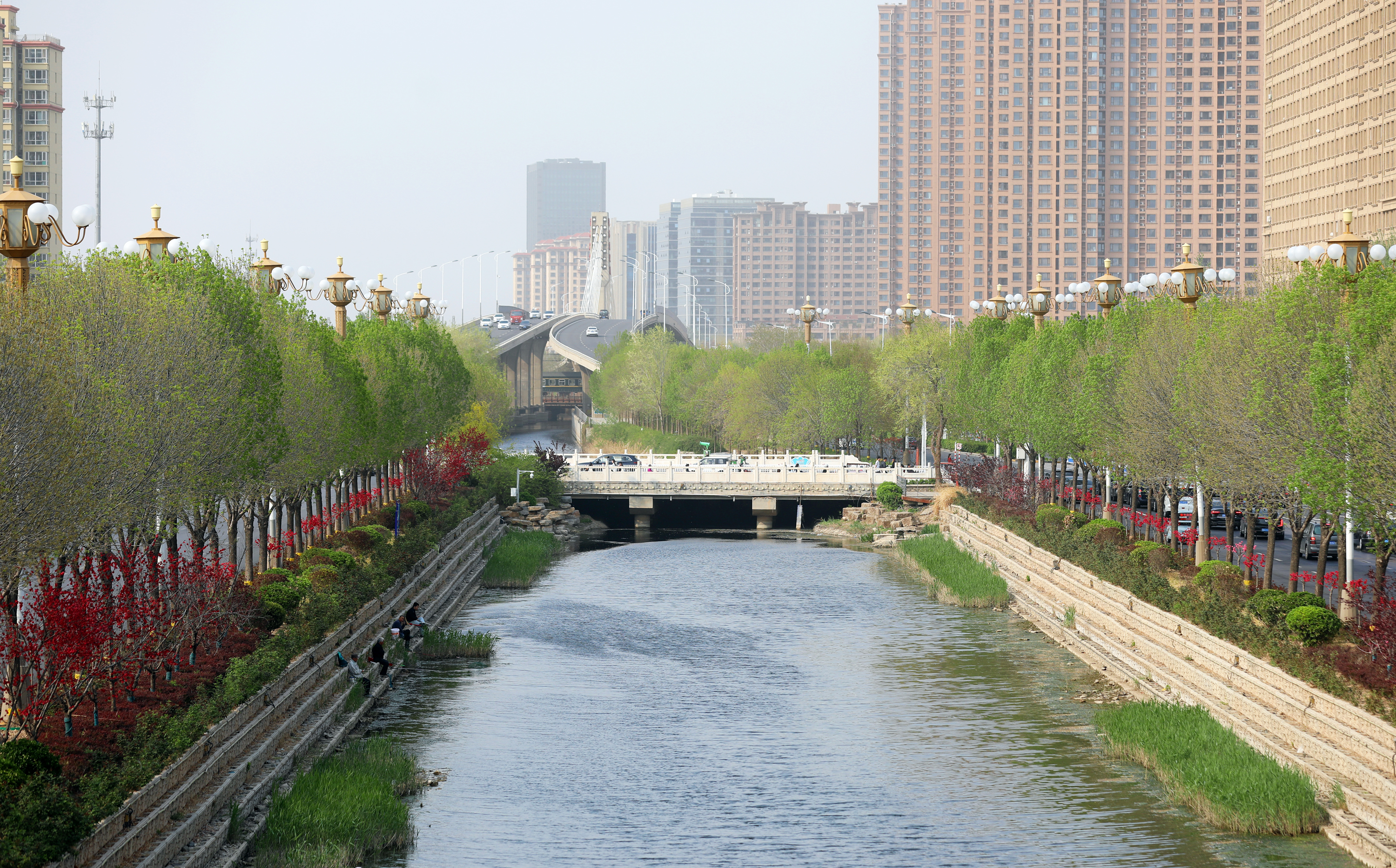 站在前进大街天桥处,映入眼帘的是一排排绿意盎然的白蜡树、色彩鲜艳的碧桃花,给人留下深刻的印象。碧桃树上鲜花一簇簇、一朵朵,挤满枝头,红的似火,粉的似霞,每一朵都散发着独特的魅力,令人目不暇接。市民徜徉在桃花间或闻着醉人的清香,或与娇媚的桃花一起合影留念,乐享春日好时光。