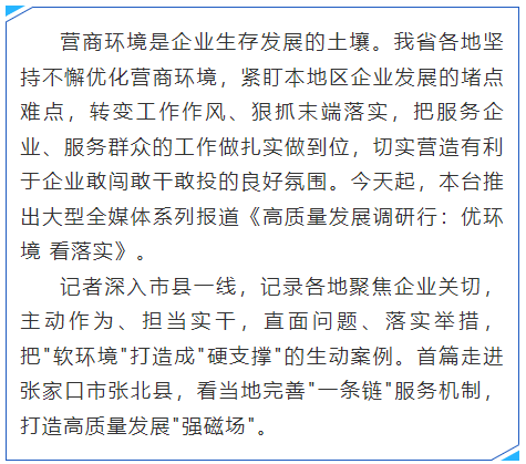 急企业所需、想企业所盼、解企业所难。张北县结合本地实际,创新优化审批流程和服务模式;提供"一条链"管家服务,把企业关切当成"心头大事",让项目不但落地快、建设快,更能发展好,以营商环境的持续优化打造高质量发展"强磁场",跑出推动产业快速发展的"加速度"。