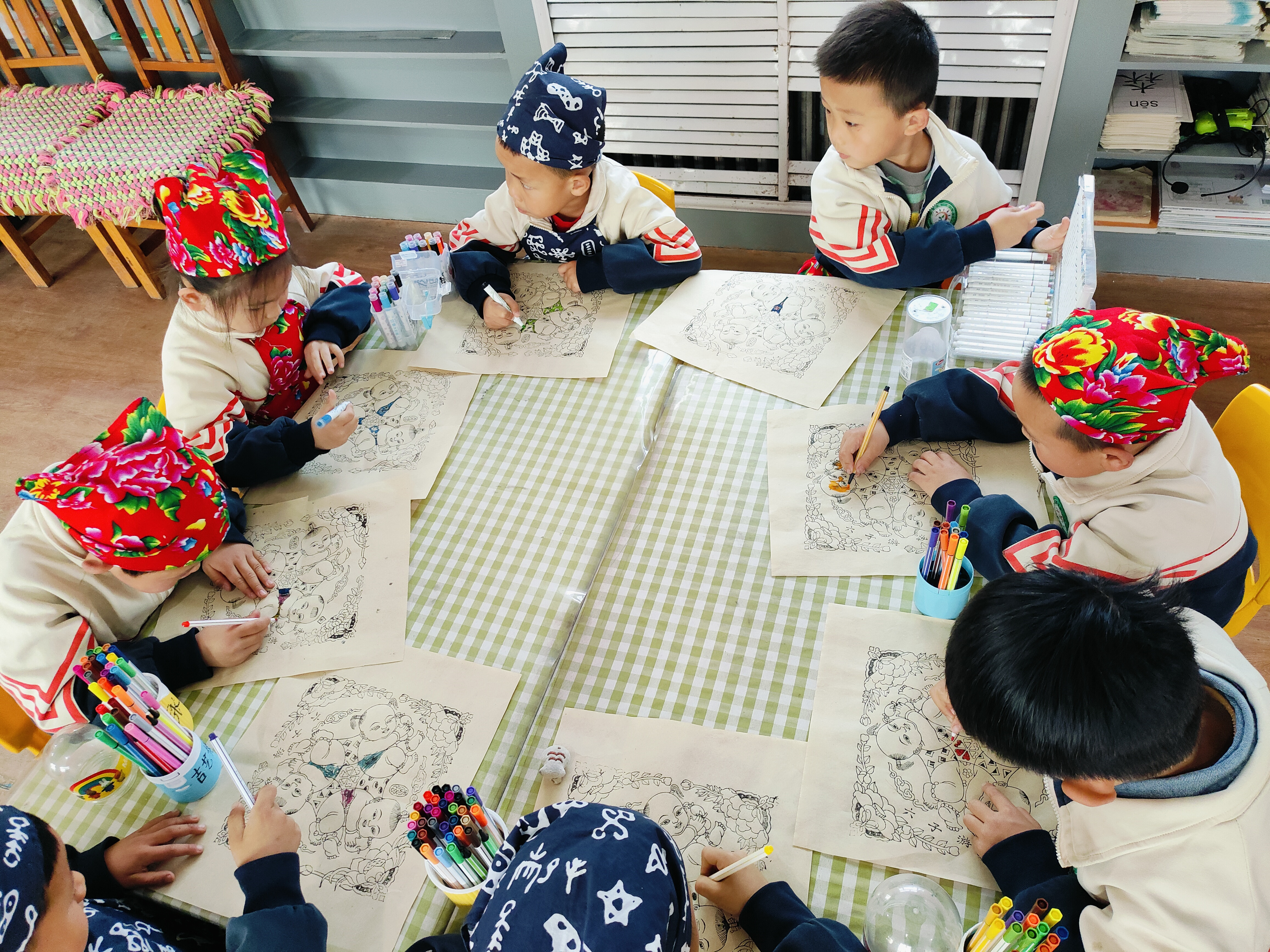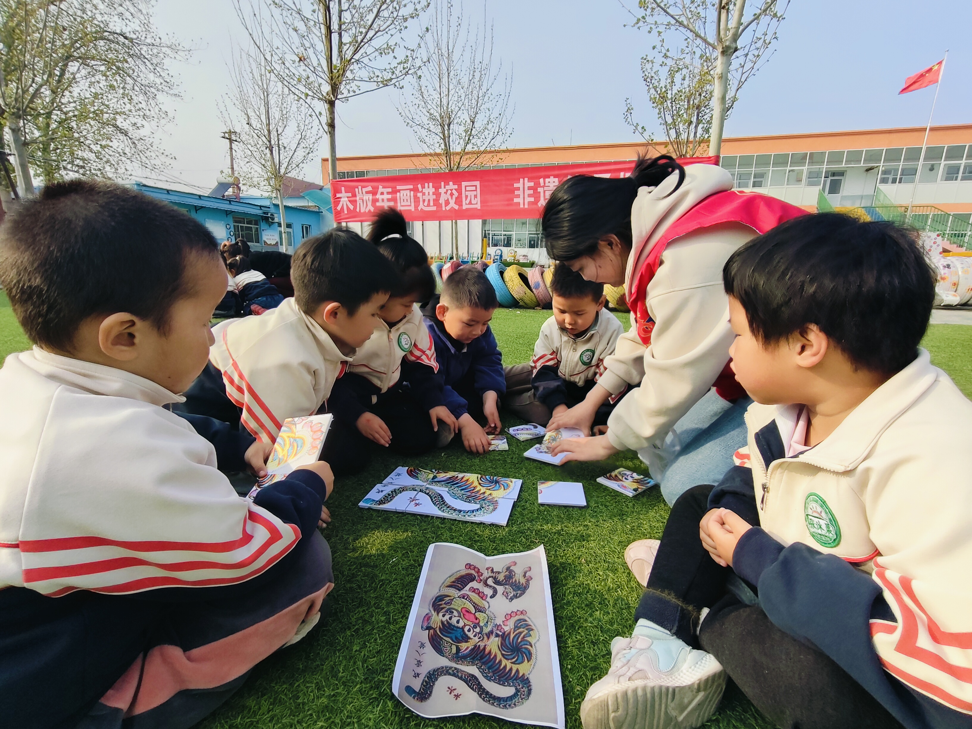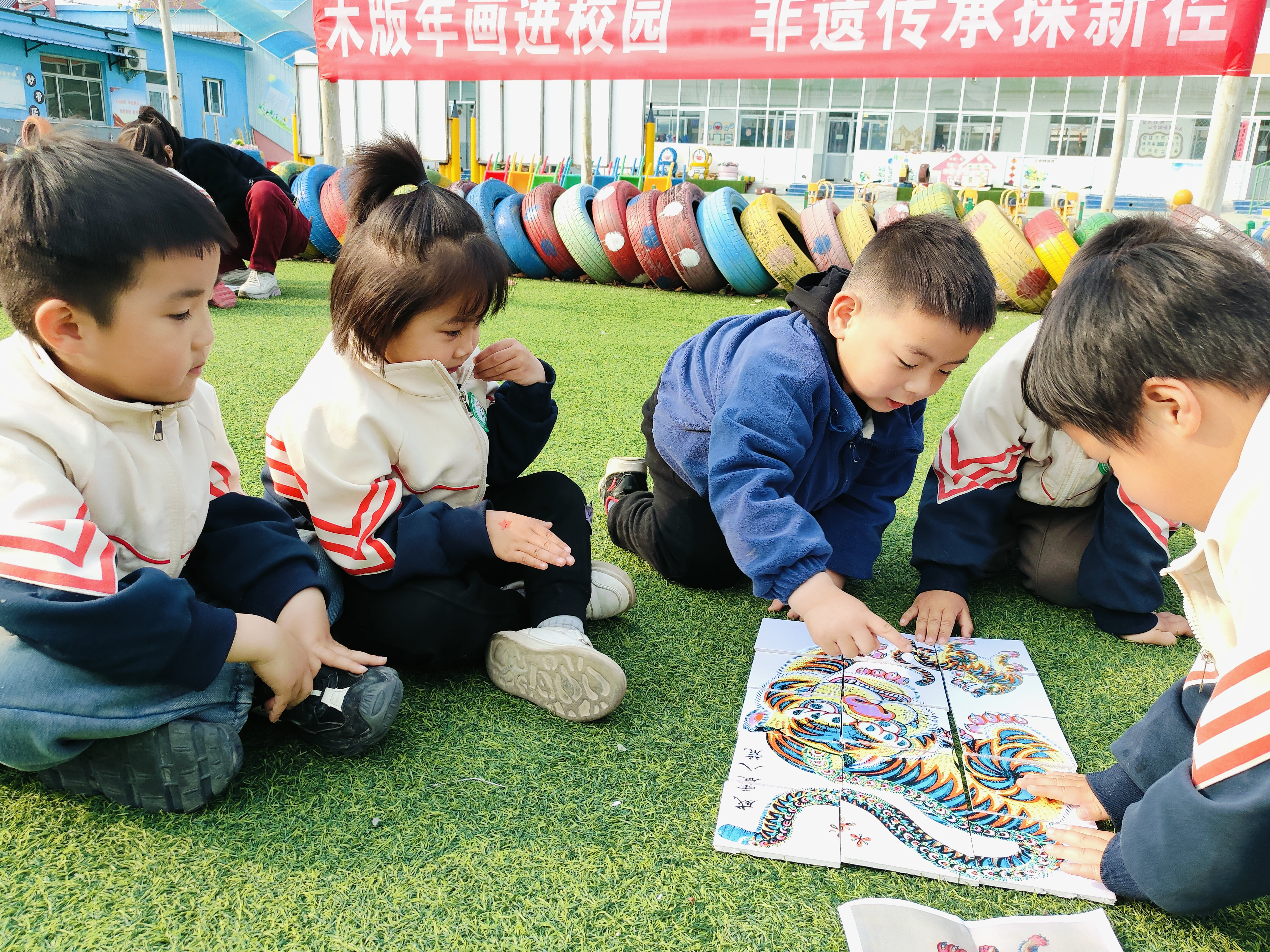 在年画拼图游戏环节中,《六子争头》《狮子滚球》《花开富贵》《威震八荒》《连年有余》等传统年画被做成了一块一块的小拼图,孩子们在认识年画的同时积极动手、开动脑筋,不一会儿一幅幅完整的年画拼接而成。