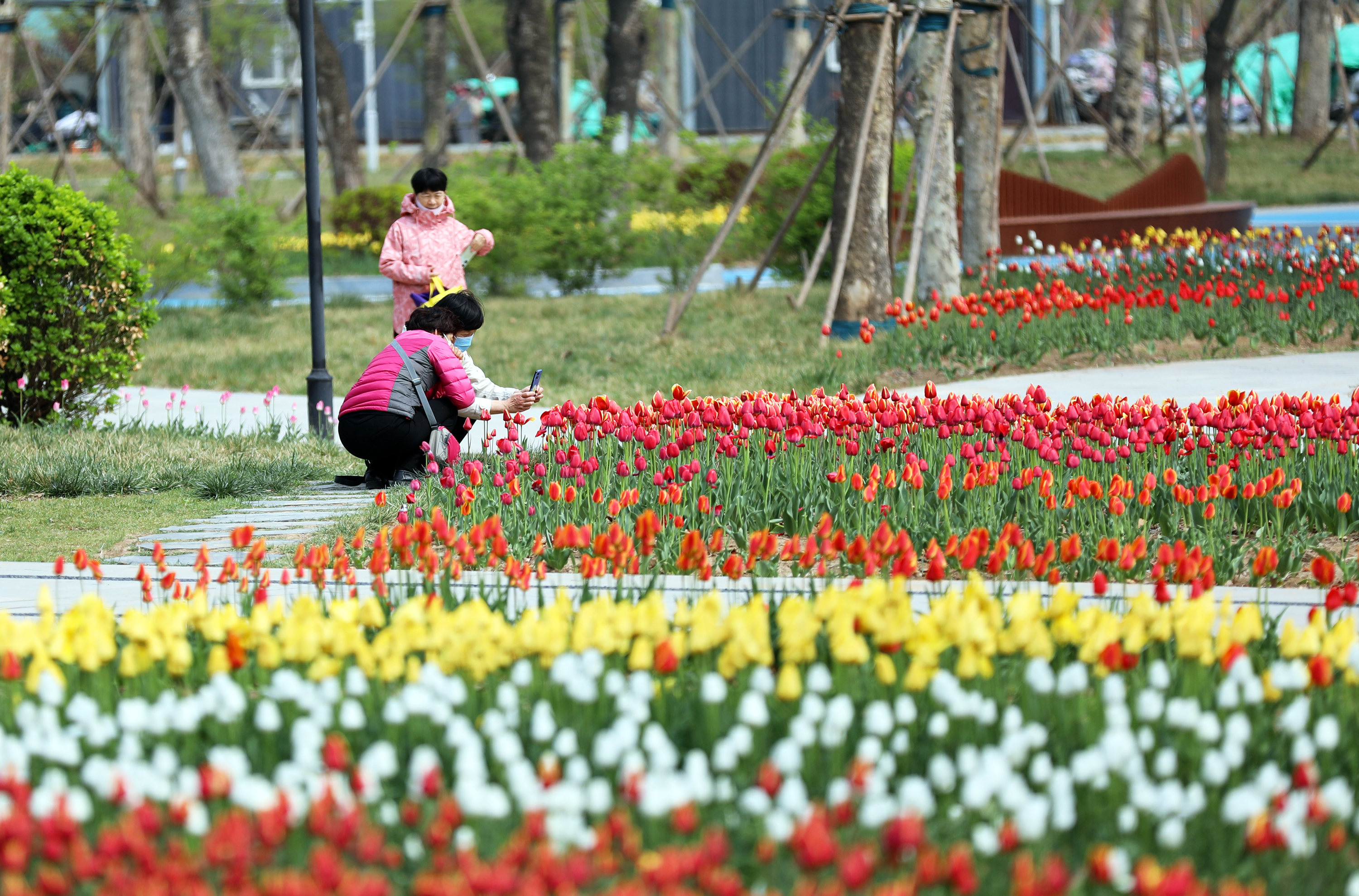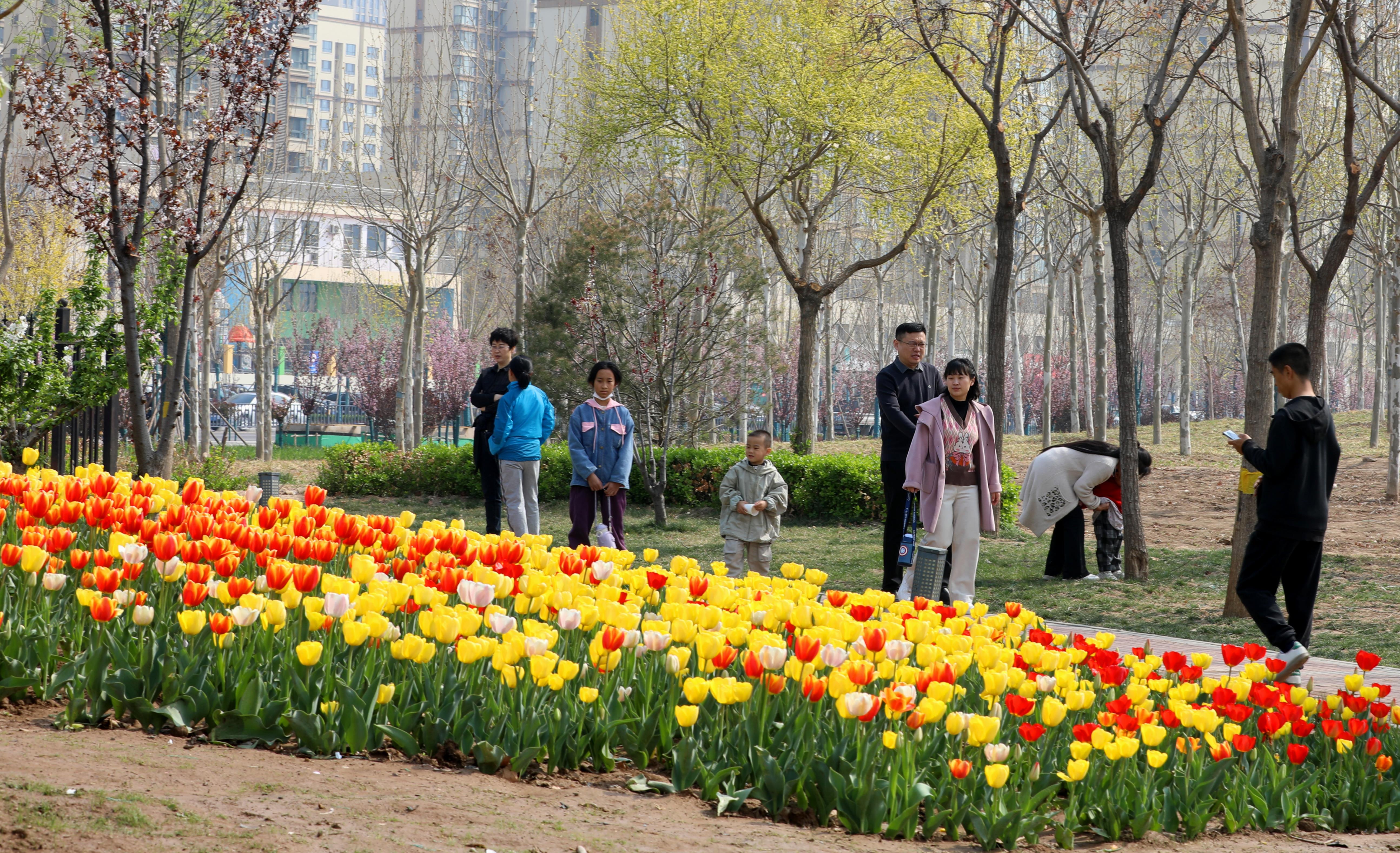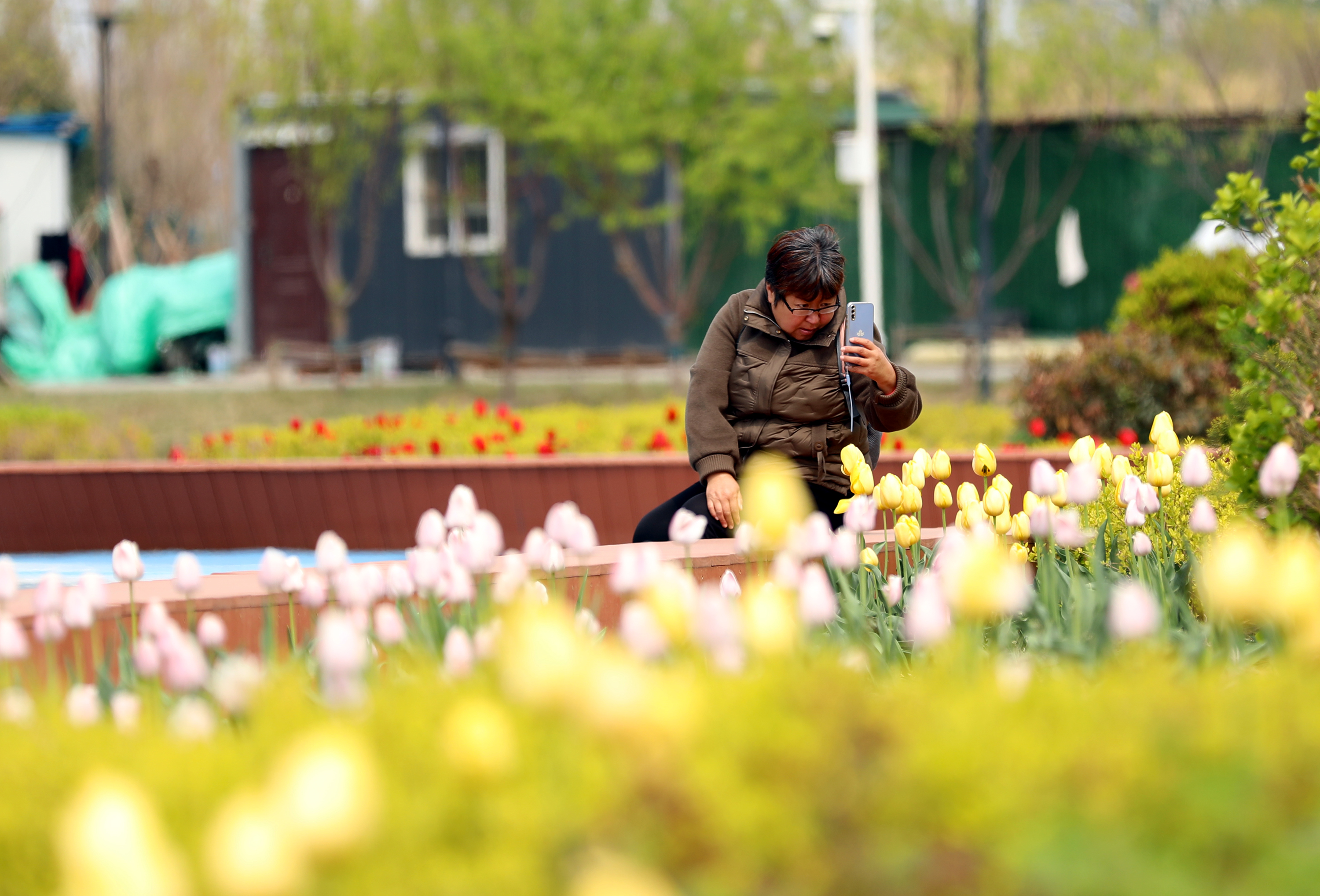 沿着公园的游步道走去,一朵朵、一丛丛的郁金香映入眼帘。在微风的吹拂下,郁金香轻盈舞动,红色白色黄色粉色……不同颜色的郁金香交织成一片色彩缤纷的花海。不少市民或三两漫步、或拍照留念,尽情穿梭在花海里踏青赏春,让春天的美好在手机中定格。