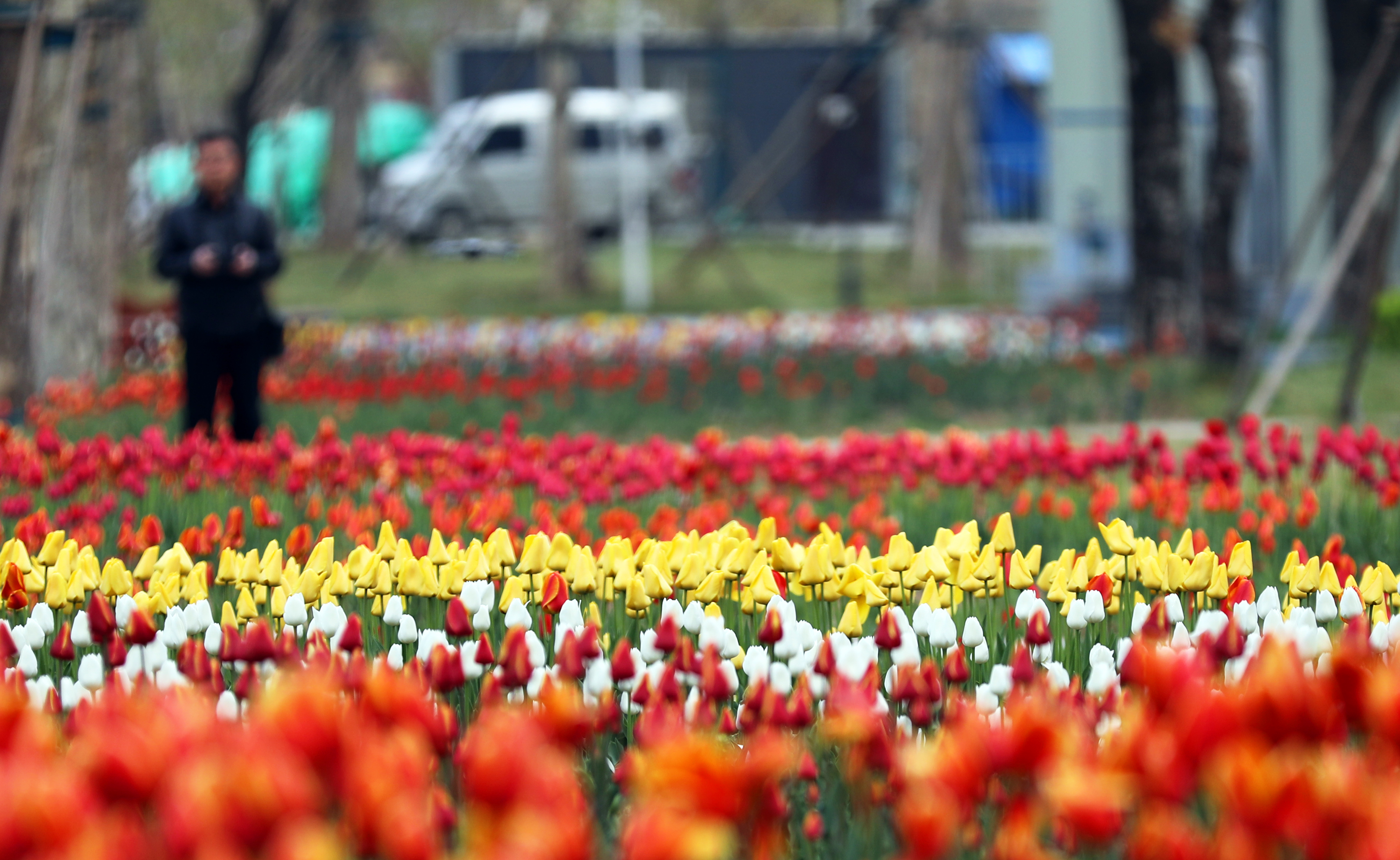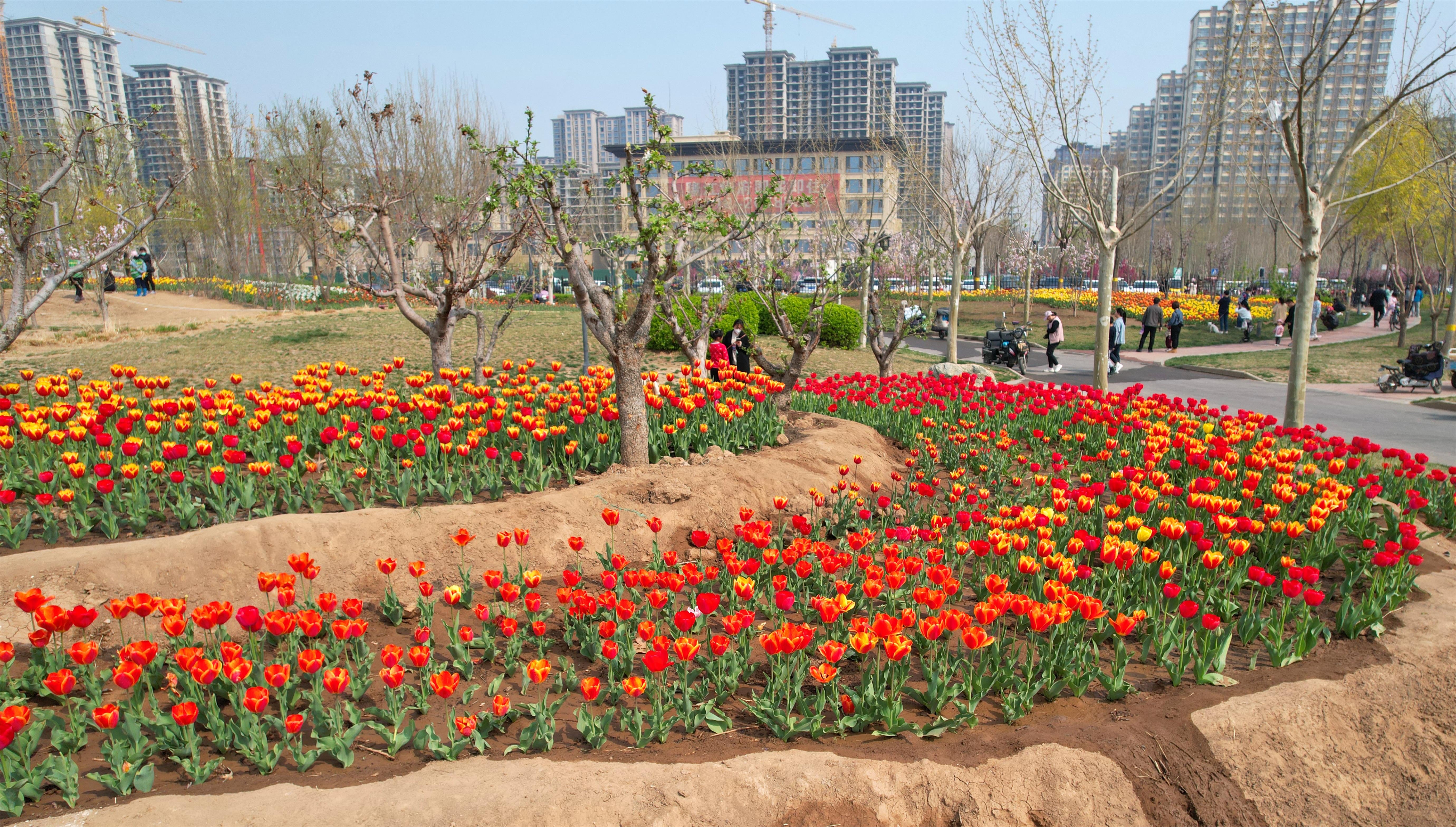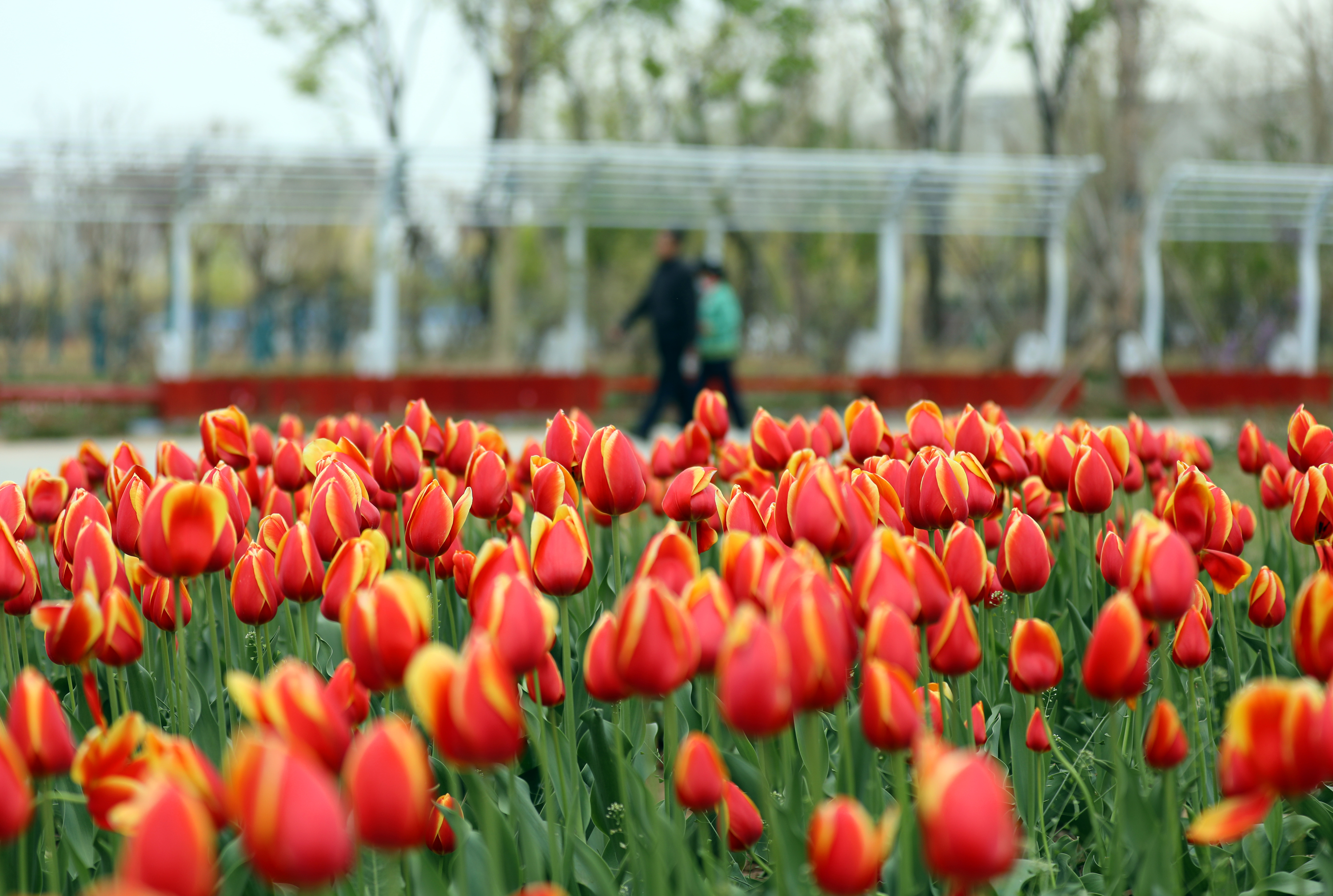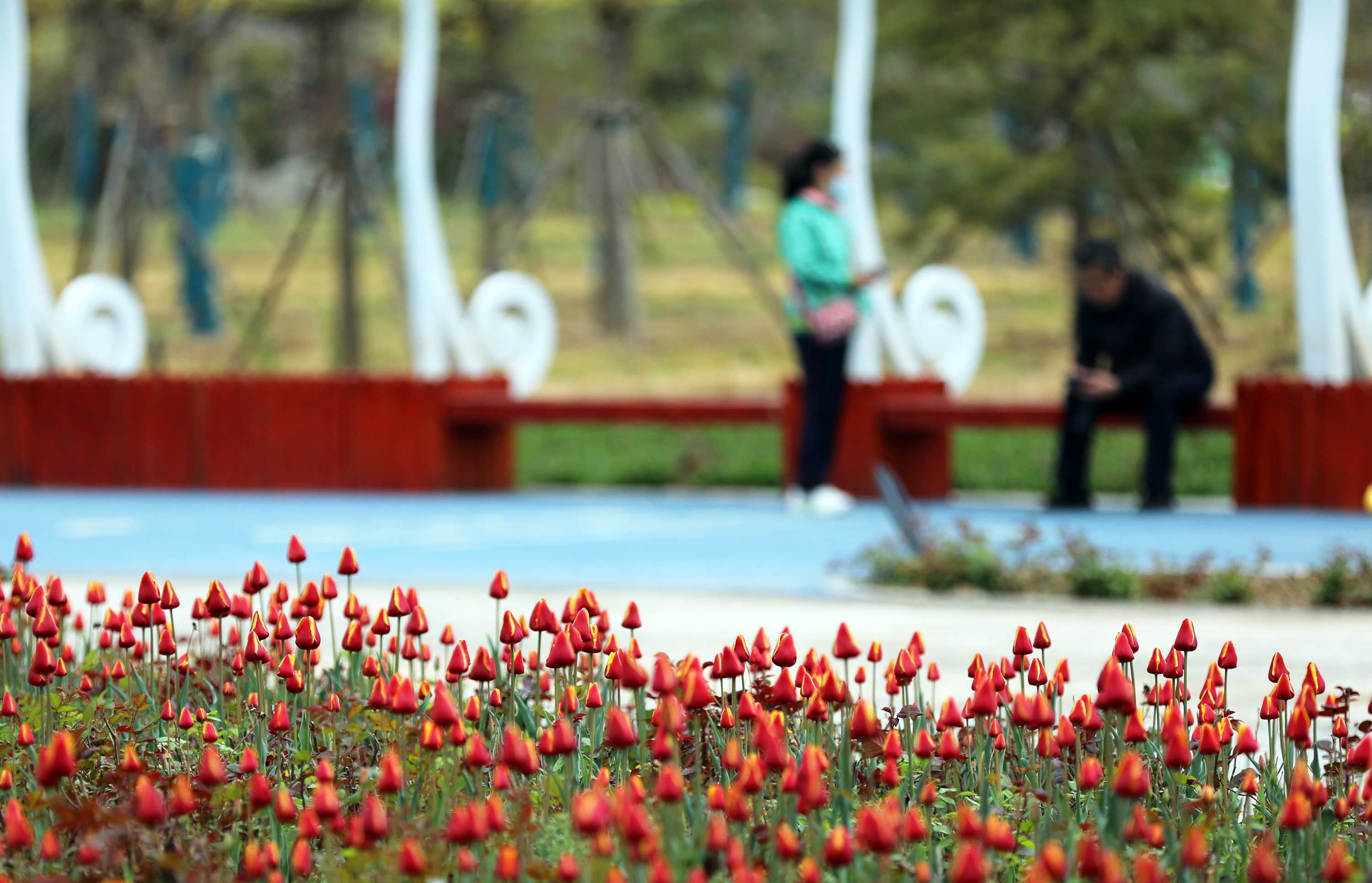 沿着公园的游步道走去,一朵朵、一丛丛的郁金香映入眼帘。在微风的吹拂下,郁金香轻盈舞动,红色白色黄色粉色……不同颜色的郁金香交织成一片色彩缤纷的花海。不少市民或三两漫步、或拍照留念,尽情穿梭在花海里踏青赏春,让春天的美好在手机中定格。