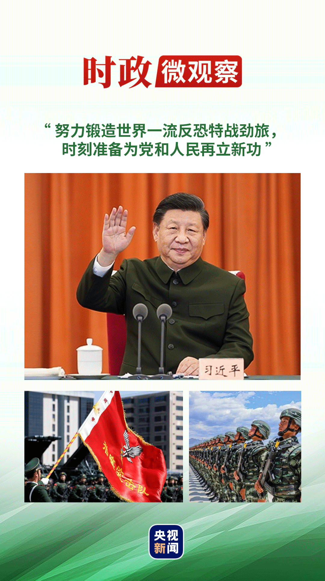 “得知10年来你们坚定举旗铸魂,苦练特战本领,很好完成了担负的任务,我感到很高兴。”习近平主席再次寄语,“希望你们再接再厉,不断锤炼忠诚品格,加强实战化针对性训练,发扬一不怕苦、二不怕死战斗精神,努力锻造世界一流反恐特战劲旅,时刻准备为党和人民再立新功。”