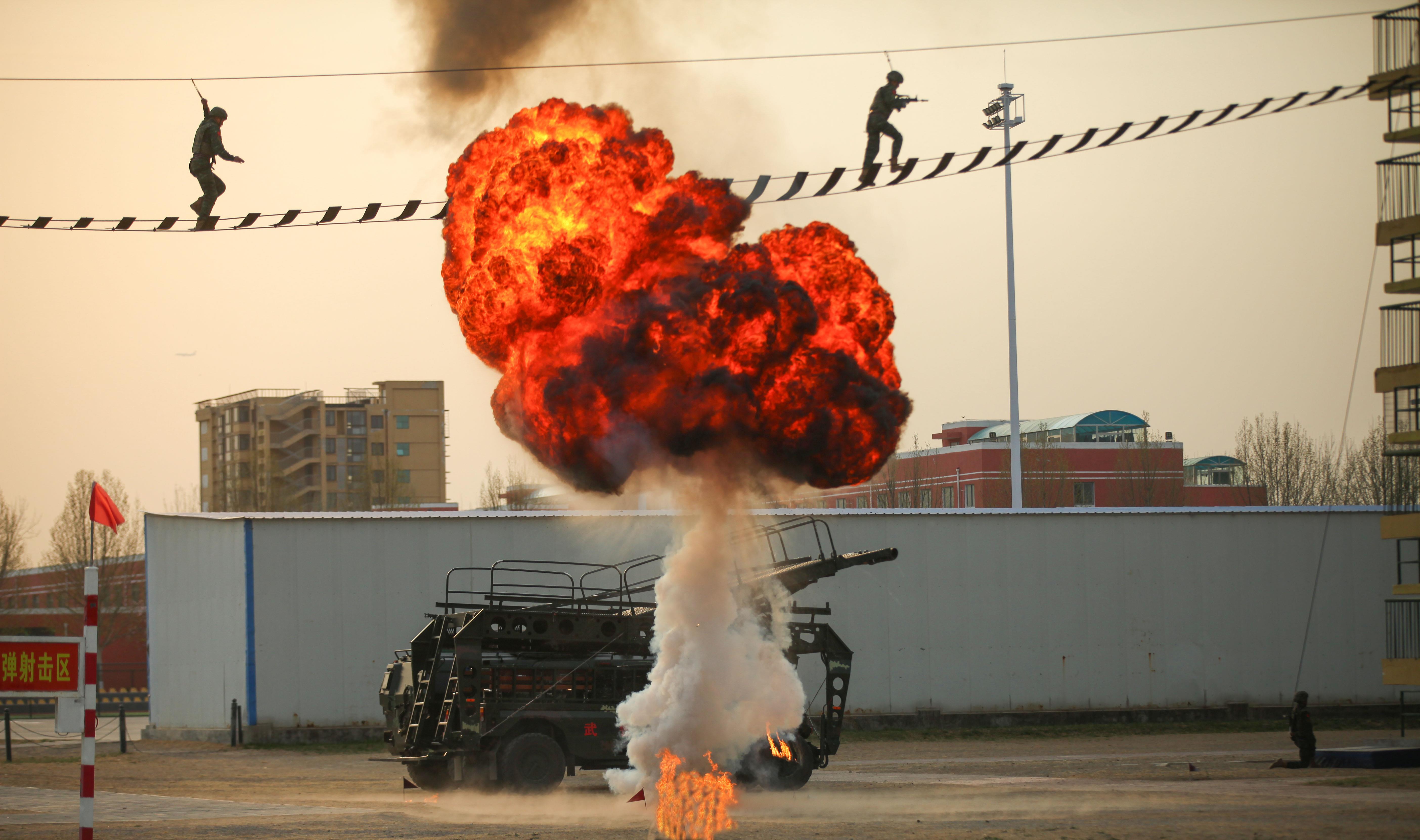 硝烟、炮火声中,特战队员通过云梯、钢索等,快速抵达任务区。在无人机和突击装备加持下,实战化训练的攻击体系更加立体,火力打击更加精准,指挥协同更加集成。在不远处,“从这里走向战场”的大字,熠熠生辉。