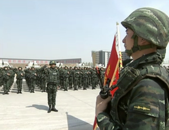 在“猎鹰突击队”授旗仪式上,习主席将队旗郑重授予“猎鹰突击队”大队长,全体队员向队旗行举手礼并庄严宣誓。