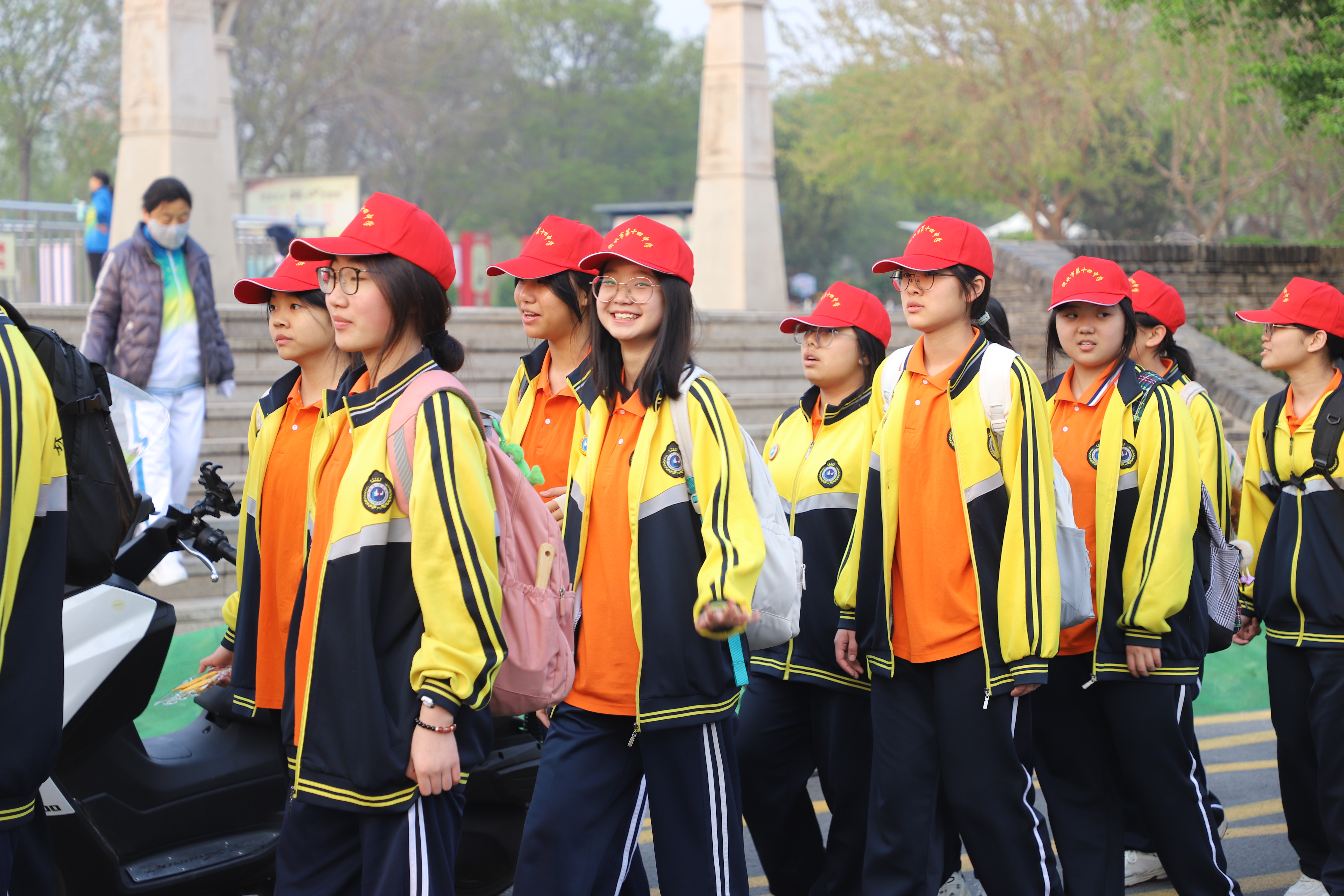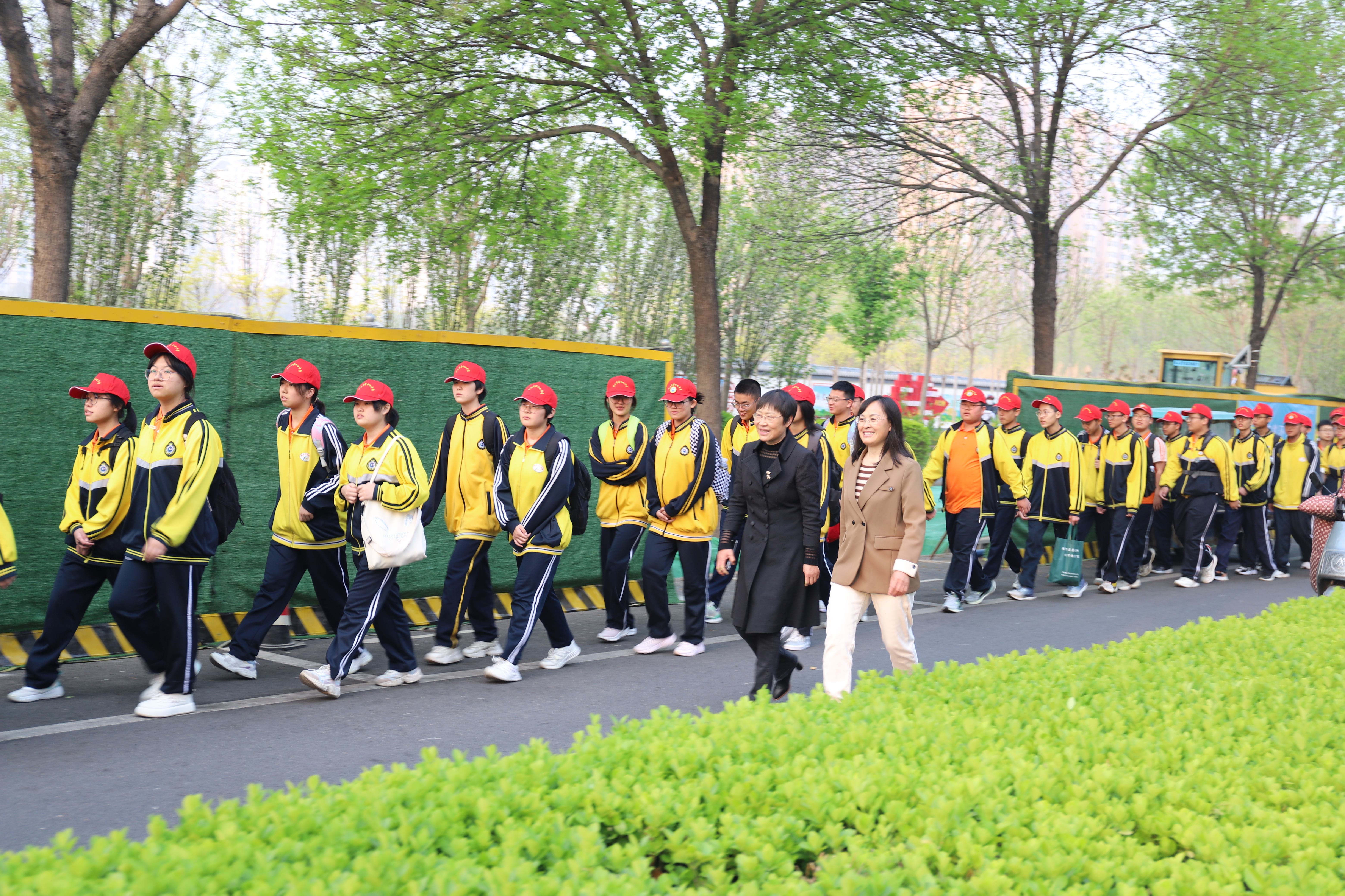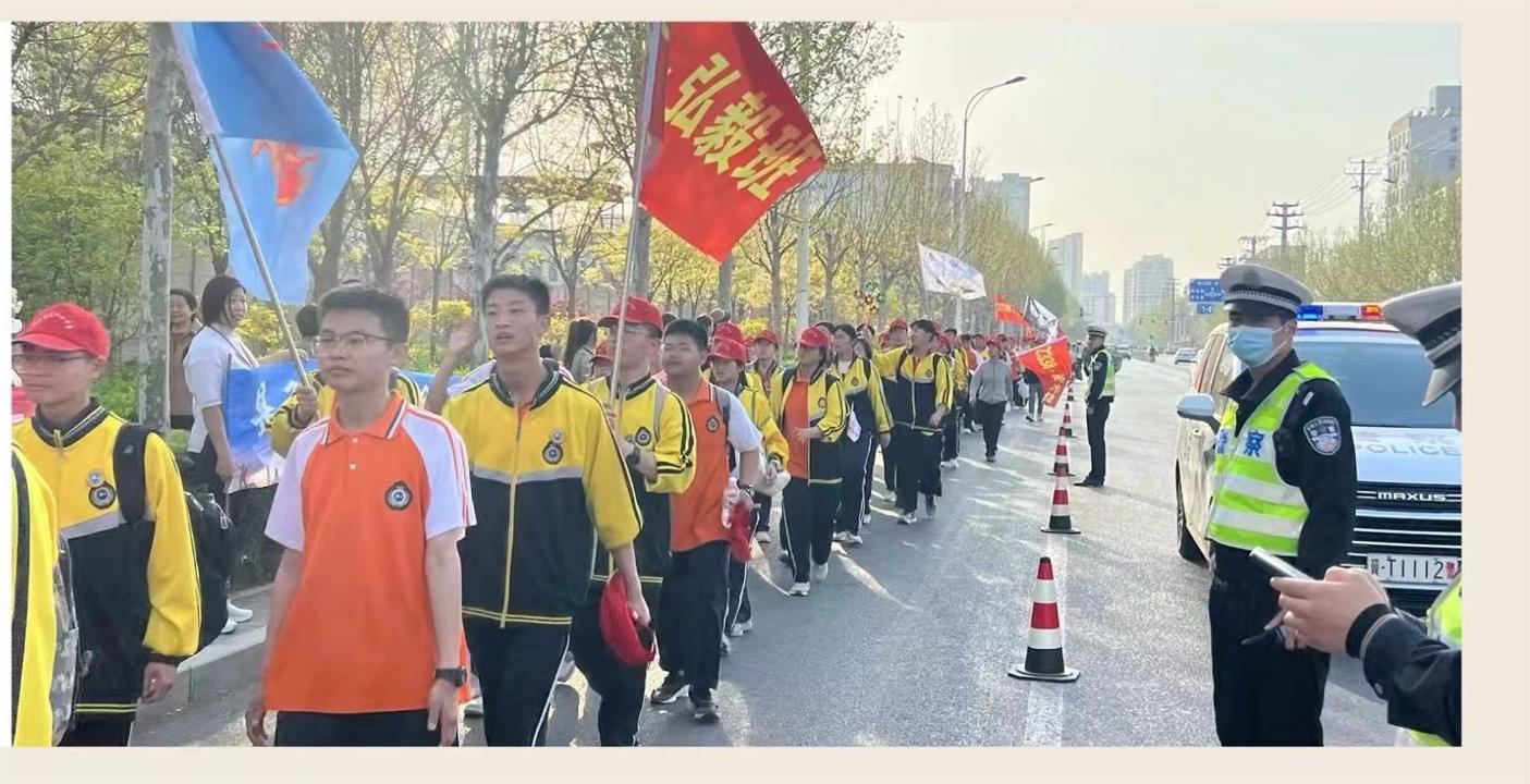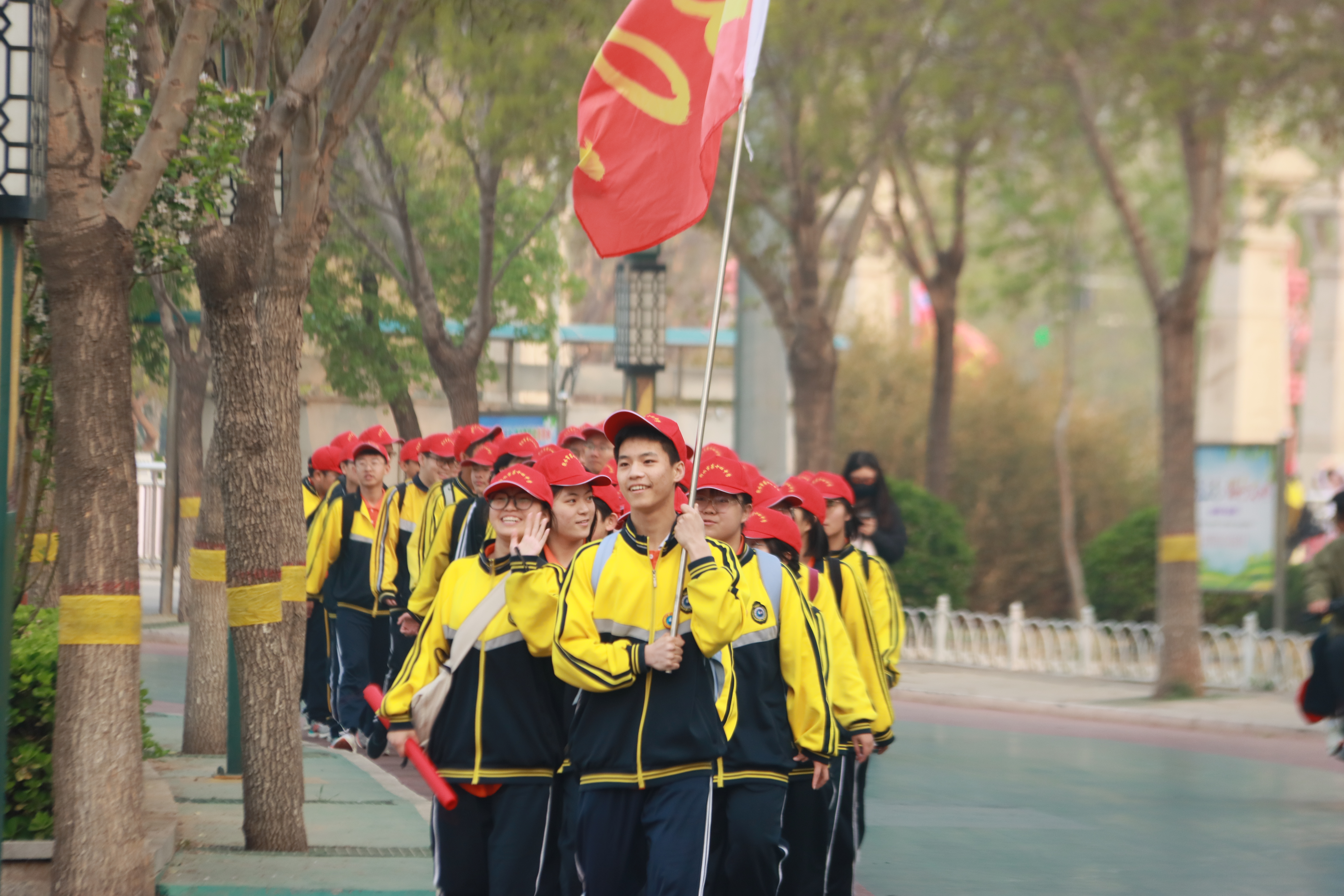 一路春光一路景,飘扬的彩旗、青春的笑脸、自信昂扬的精神风貌,共同绘制出四月最美的画卷。体力的消耗,腿脚的酸痛,也无法阻挡前行的步伐,同学们用毅力对抗着途中的艰辛,步履不停,谱写出激昂的青春赞歌。