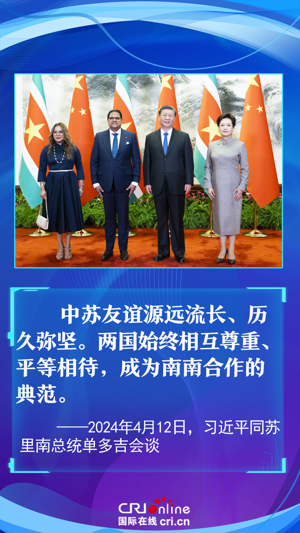 今年是中国和苏里南建立战略合作伙伴关系五周年。习近平主席在会谈中以“源远流长、历久弥坚”为中苏友谊增添了新的注解,为推动构建更加紧密的中苏战略合作伙伴关系指明了方向。