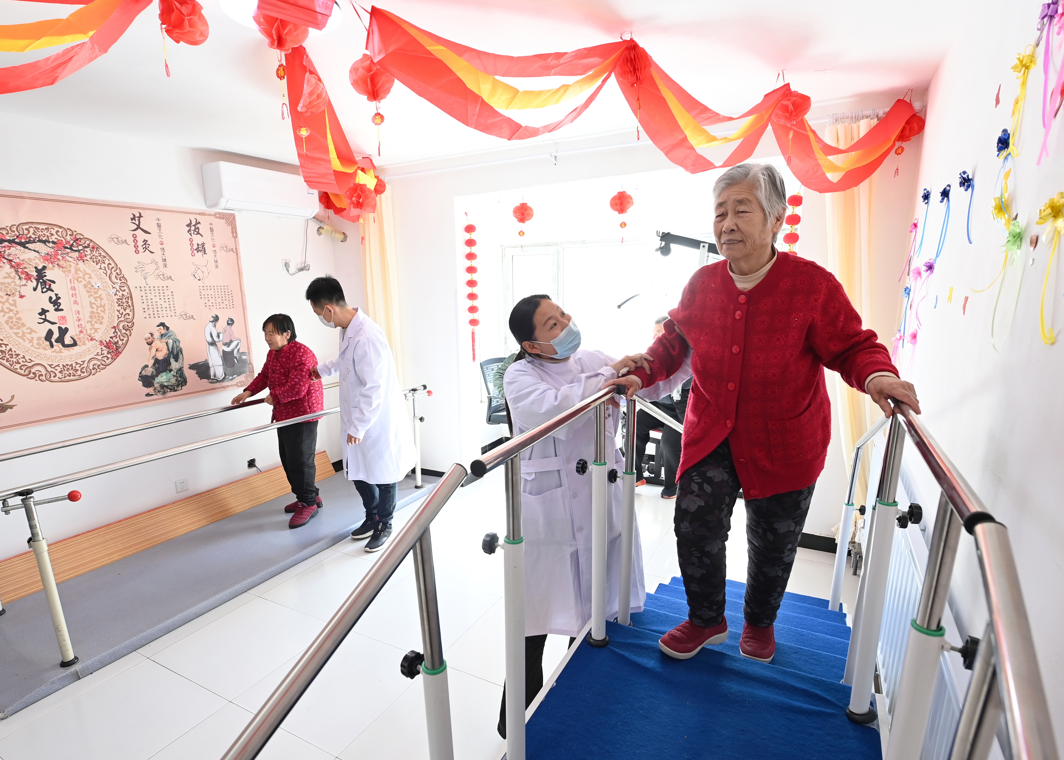 2024 年 2 月 29 日,在香河县安平镇运河新村医养中心,老年人在进行康复训练。