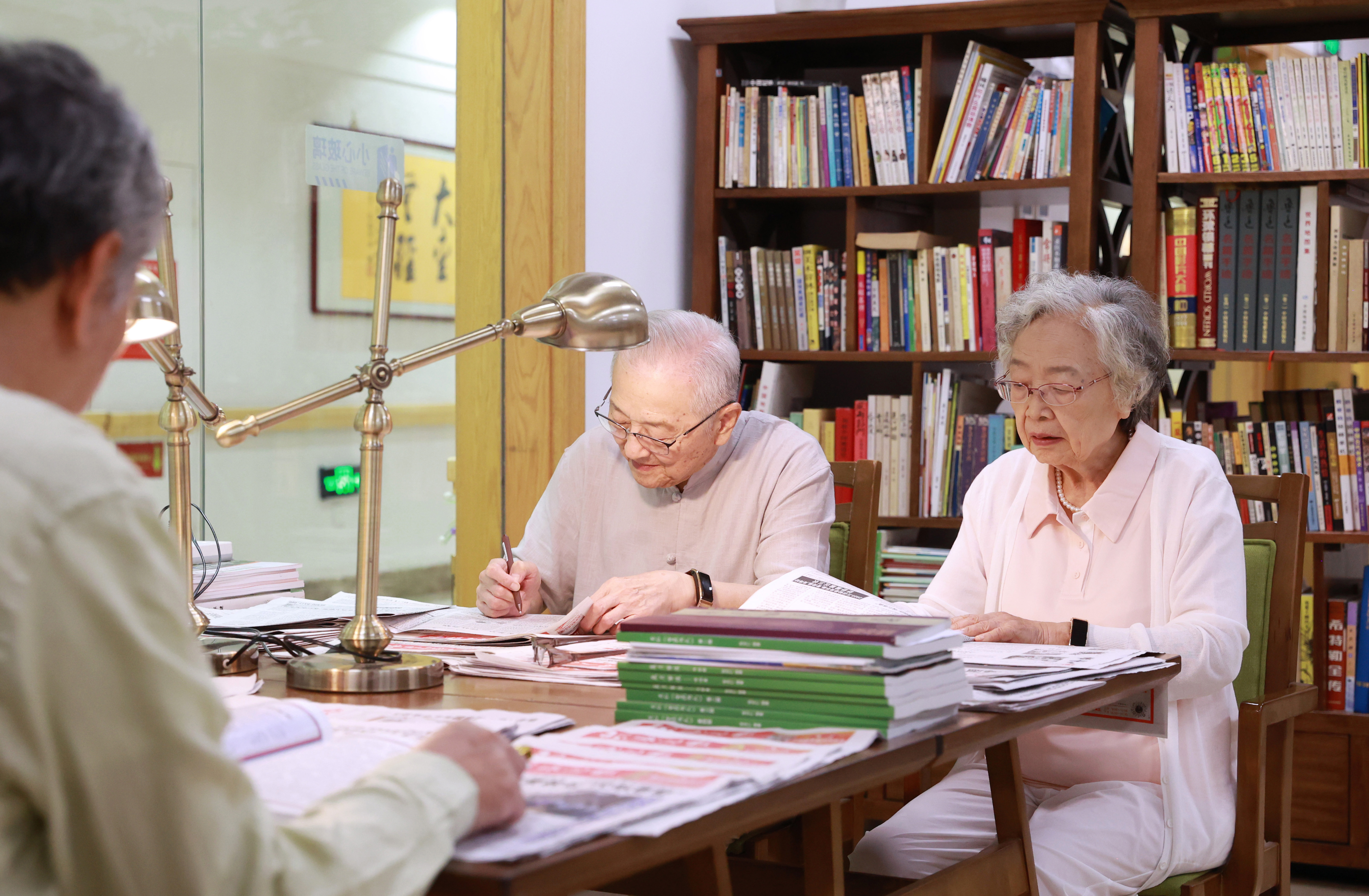 2024 年 4 月 1 日,香河县大爱城内,老年人在大爱书院康养中心读书写字。