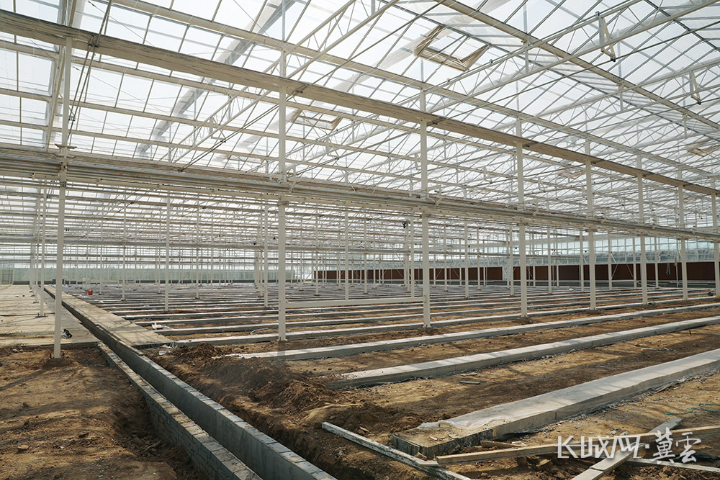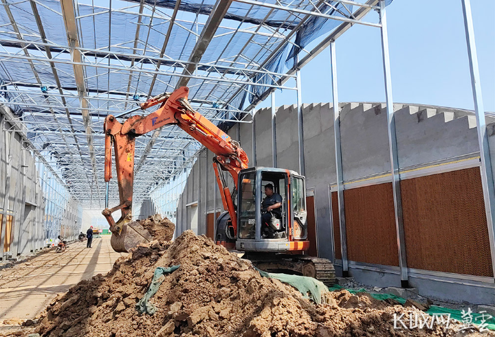 “从2023年9月项目实施以来,我们全力拉满了建设‘进度条’,目前建设的是项目一期。”项目负责人王学鹏介绍,所有温室土建基础和墙体以及主体骨架已安装完成,现正进行土建装饰施工,部分设备设施也已进场开始安装,计划2024年7月份建成开始调试。