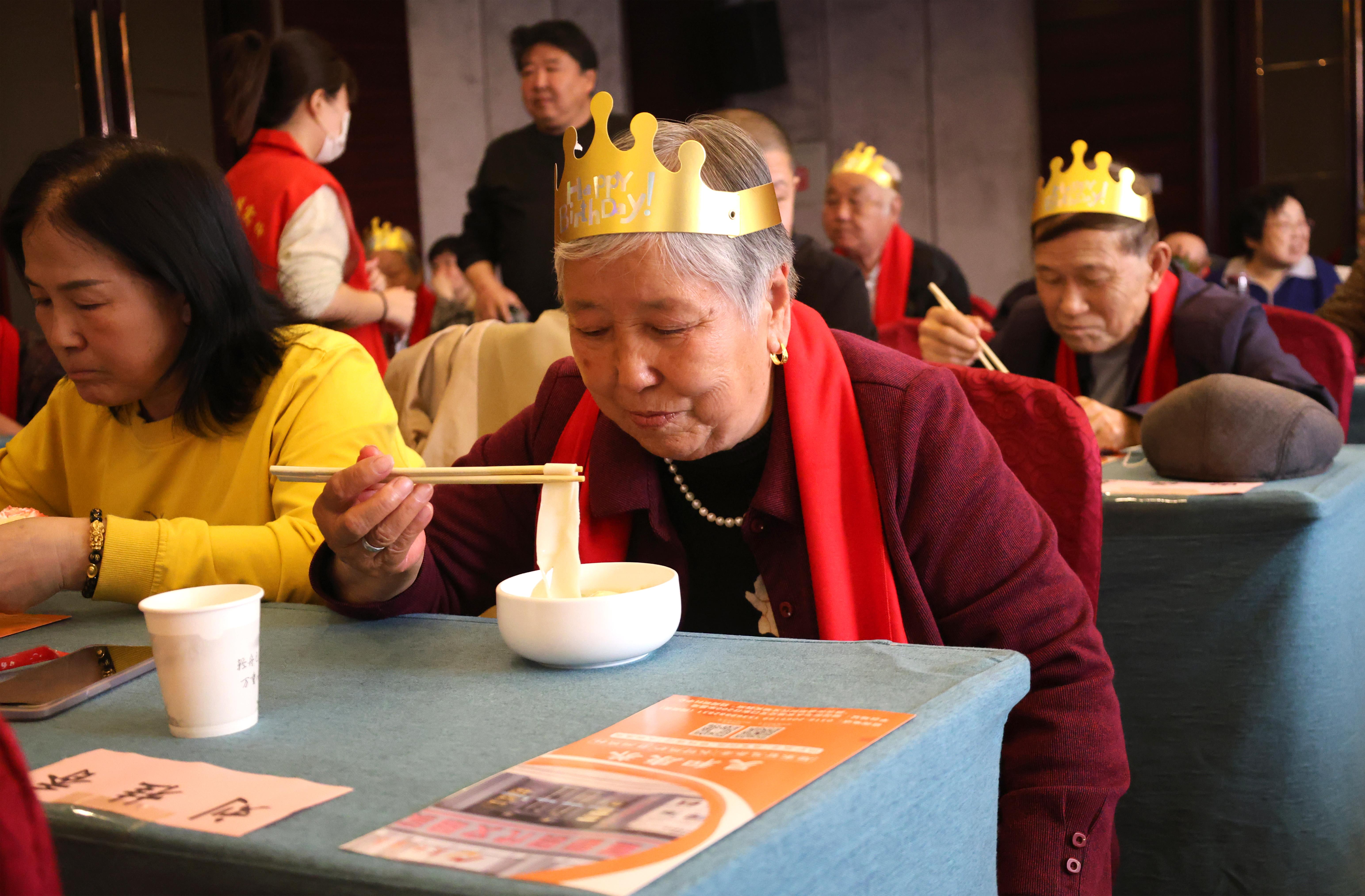 随后,街道办的工作人员为每位老人戴上红色的围巾。此外,社区还为寿星精心准备了长寿面,老人们笑逐颜开的一边品尝着美食,一边与老伙计们话家常,现场气氛温馨融洽。