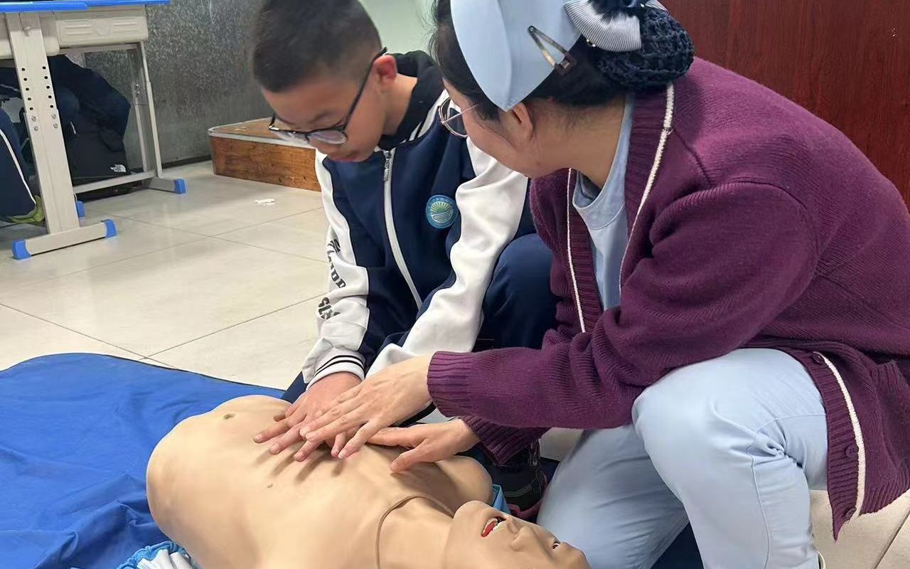 海姆立克急救法和心肺复苏急救法是应对突发状况最常用的急救方法。在授课中,医护人员就海姆立克急救法向同学们做了规范动作演示,对每一个动作的关键节点详细讲解,同时对婴儿、儿童、成人的不同急救动作和急救方法分别演示;利用道具模拟人对心肺复苏急救法做讲解和动作演示。同学们观听边记,并且在医务人员指导下做了模拟训练。