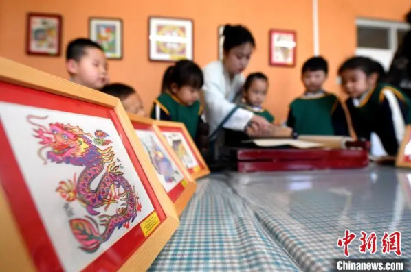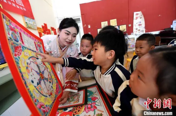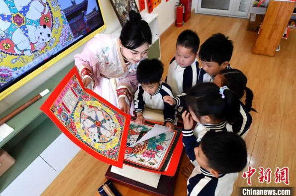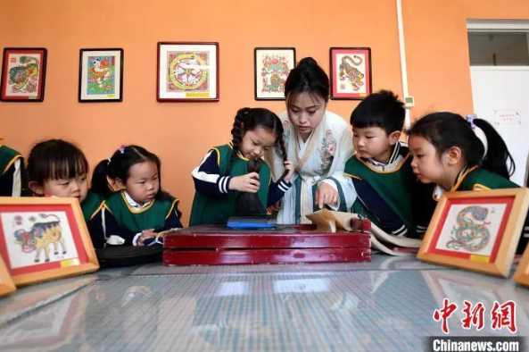 木版刷色,纸张抻平,搪子擦压,着色成画……4月16日,在河北省衡水市武强县府兴幼儿园,武强年画博物馆的讲解员正在教孩子们印制武强木版年画。此外,还设置了年画拼图、年画游戏等环节,让孩子们积极动手、动脑,“零距离”体验非遗魅力。