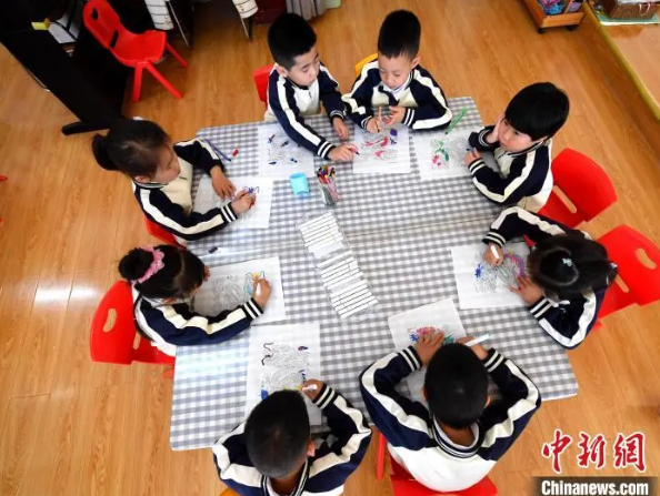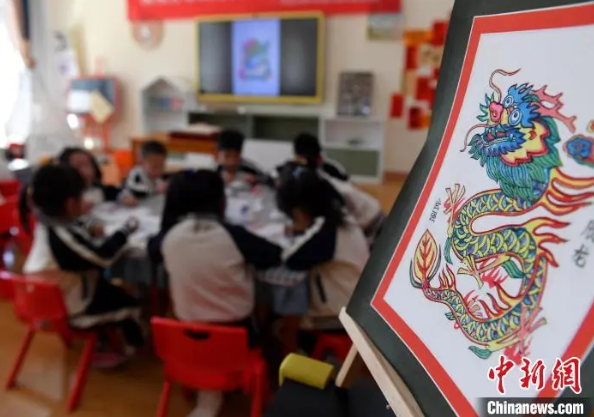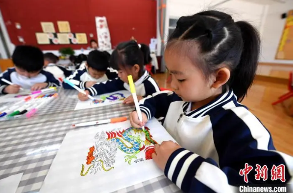 4月16日,孩子们给武强木版年画上色。贾枭梦 摄