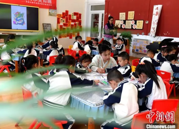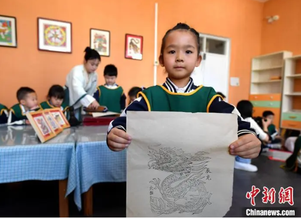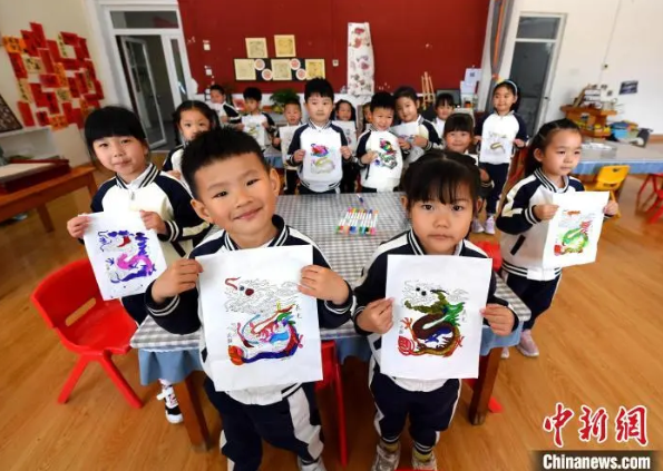 4月16日,孩子们展示自己的年画作品。贾枭梦 摄