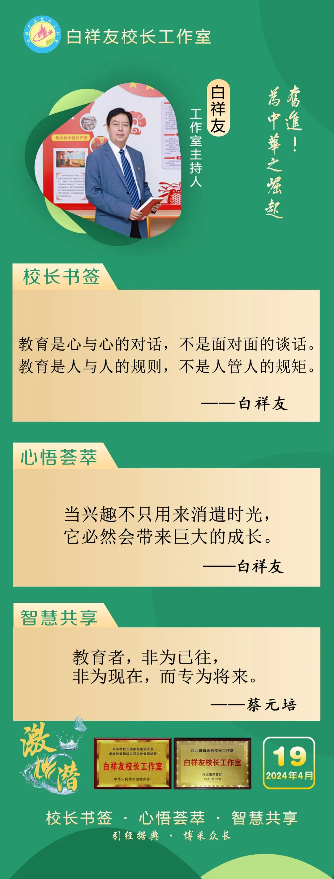 来源:白祥友校长工作室“白祥友校长工作室”成立于2019年4月,是教育部“国培计划”中小学名校长领航工程、河北省首批名校长工作室,目前省内外成员校20个。工作室坚持“资源共享、智慧共融、互助共赢”理念,已成为思想碰撞的交流场,资源共享的品牌站,成果展示的辐射源。