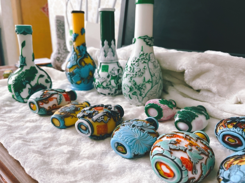 “琉璃制品有着数层与底子不同的色料,再在这些色料上根据需要绘制山水花鸟等图画,经过雕琢加工,使图画显露出来,雕镂错采,光色鲜明,琳琅悦目。”张永水说。