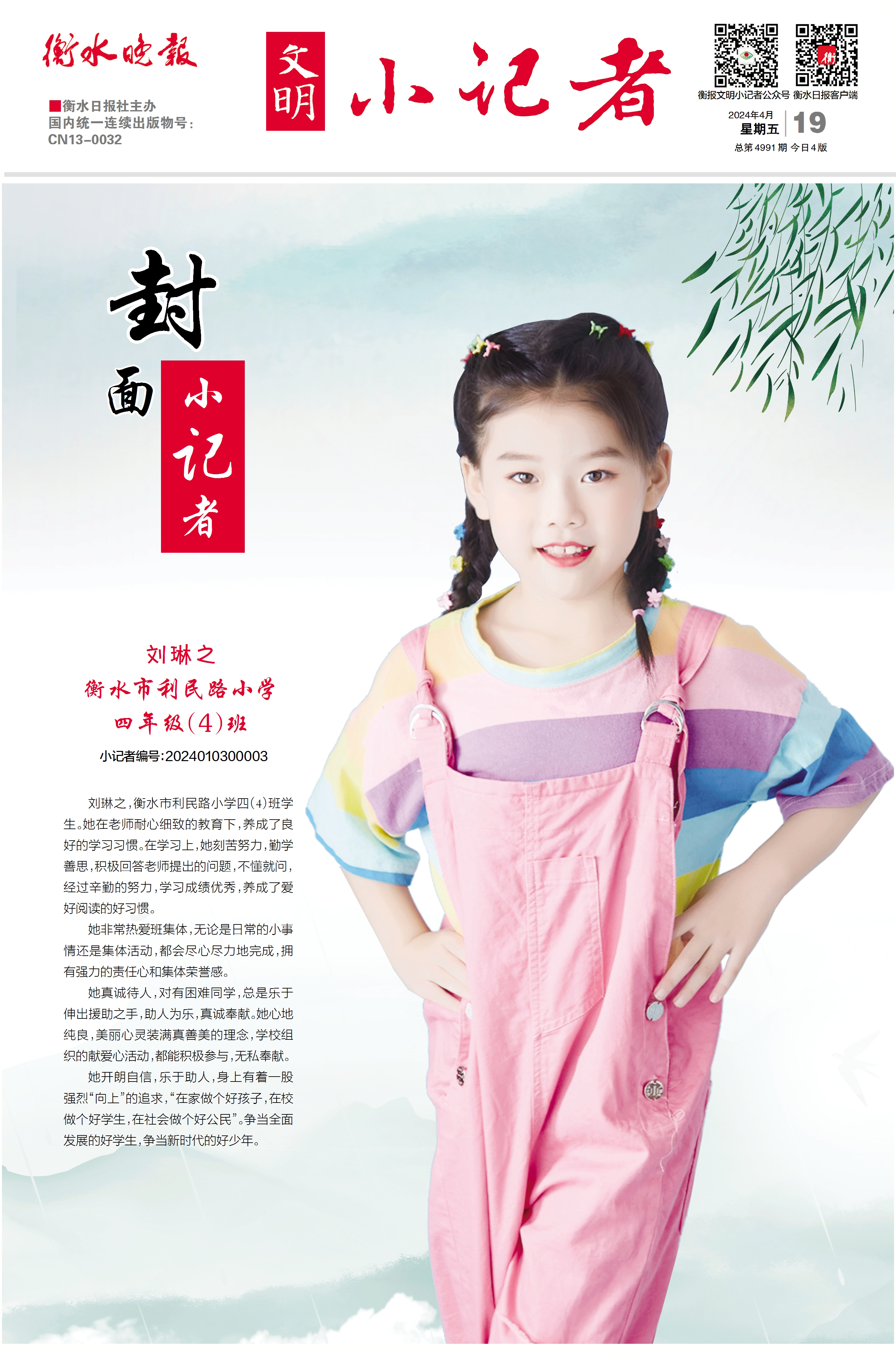 刘琳之,衡水市利民路小学四(4)班学生。她在老师耐心细致的教育下,养成了良好的学习习惯。在学习上,她刻苦努力,勤学善思,积极回答老师提出的问题,不懂就问经过辛勤的努力,学习成绩优秀,养成了爱好阅读的好习惯。她非常热爱班集体,无论是日常的小事情还是集体活动,都会尽心尽力地完成,拥有强力的责任心和集体荣誉感。她真诚待人,对有困难同学,总是乐于伸出援助之手,助人为乐,真诚奉献。她心地纯良,美丽心灵装满真善美的理念,学校组织的献爱心活动,都能积极参与,无私奉献。她开朗自信,乐于助人,身上有着一股强烈“向上”的追求,“在家做个好孩子,在校做个好学生,在社会做个好公民”。争当全面发展的好学生,争当新时代的好少年。