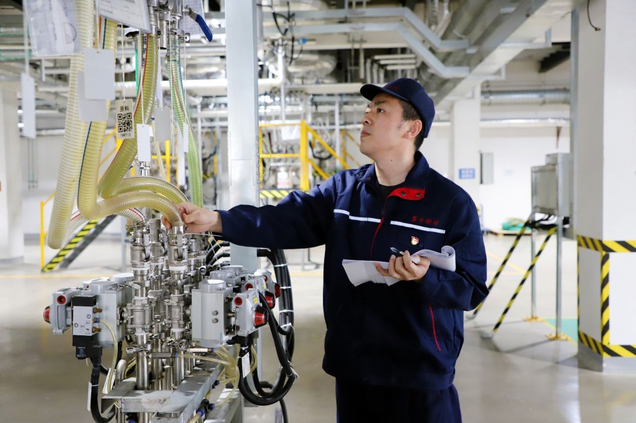 河北冀中新材料有限公司纤维部副部长马驹在浸润剂工段进行设备巡检。(陈子娟摄)