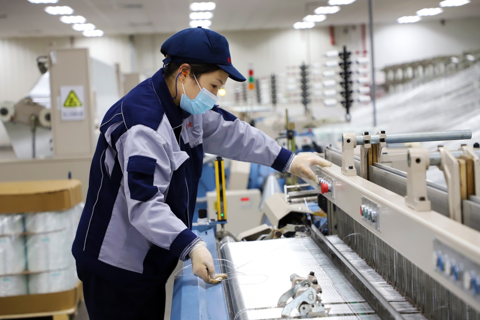 河北冀中新材料有限公司内,织布机纺织玻纤产品。(张明明摄)