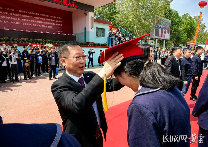 河北衡水中学党委书记郗会锁为学生冠戴“成人帽”。长城网·冀云客户端记者 卢婉凤 摄