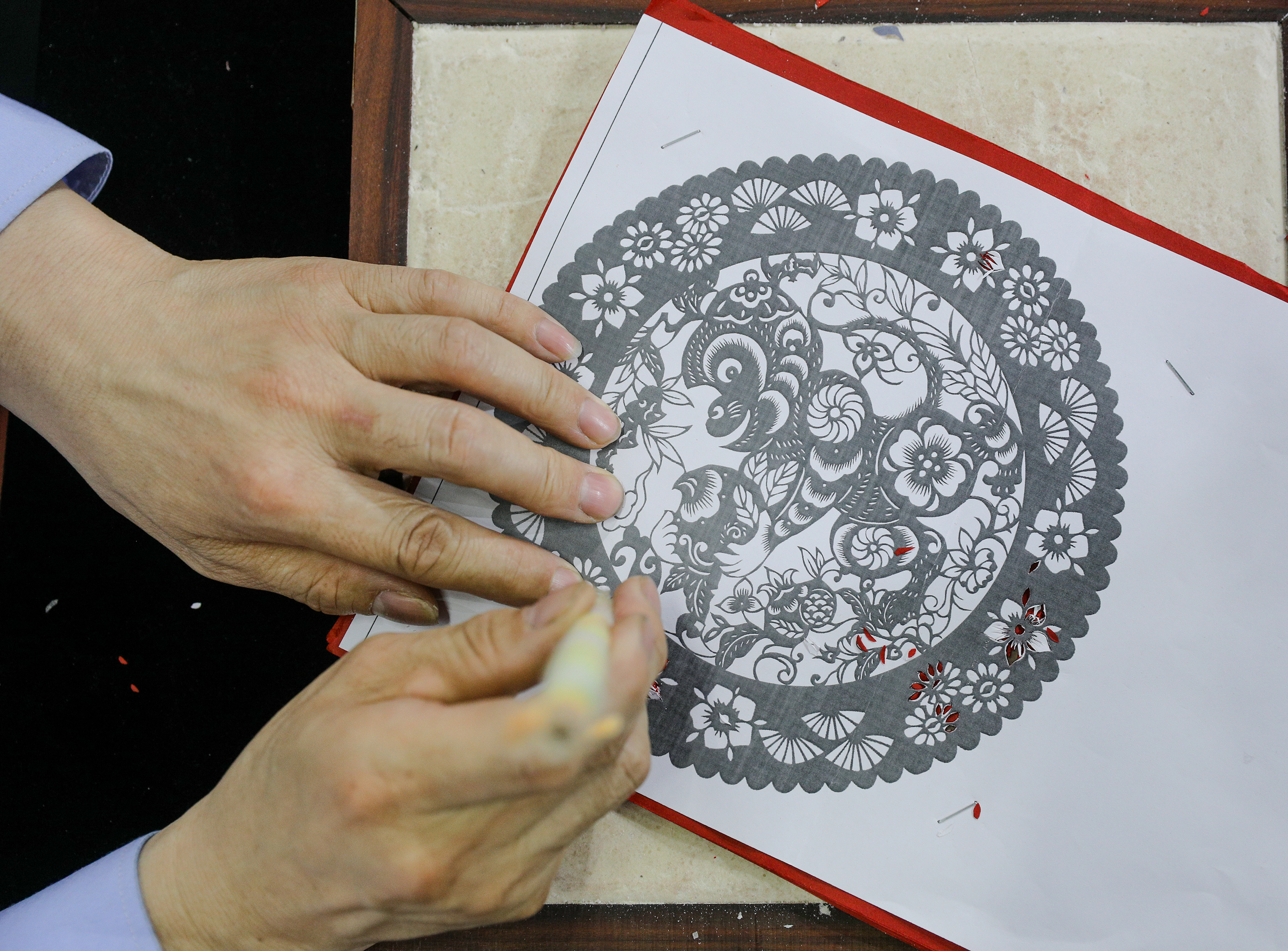 冀艺剪纸工作人员正在剪刻剪纸工艺品。
