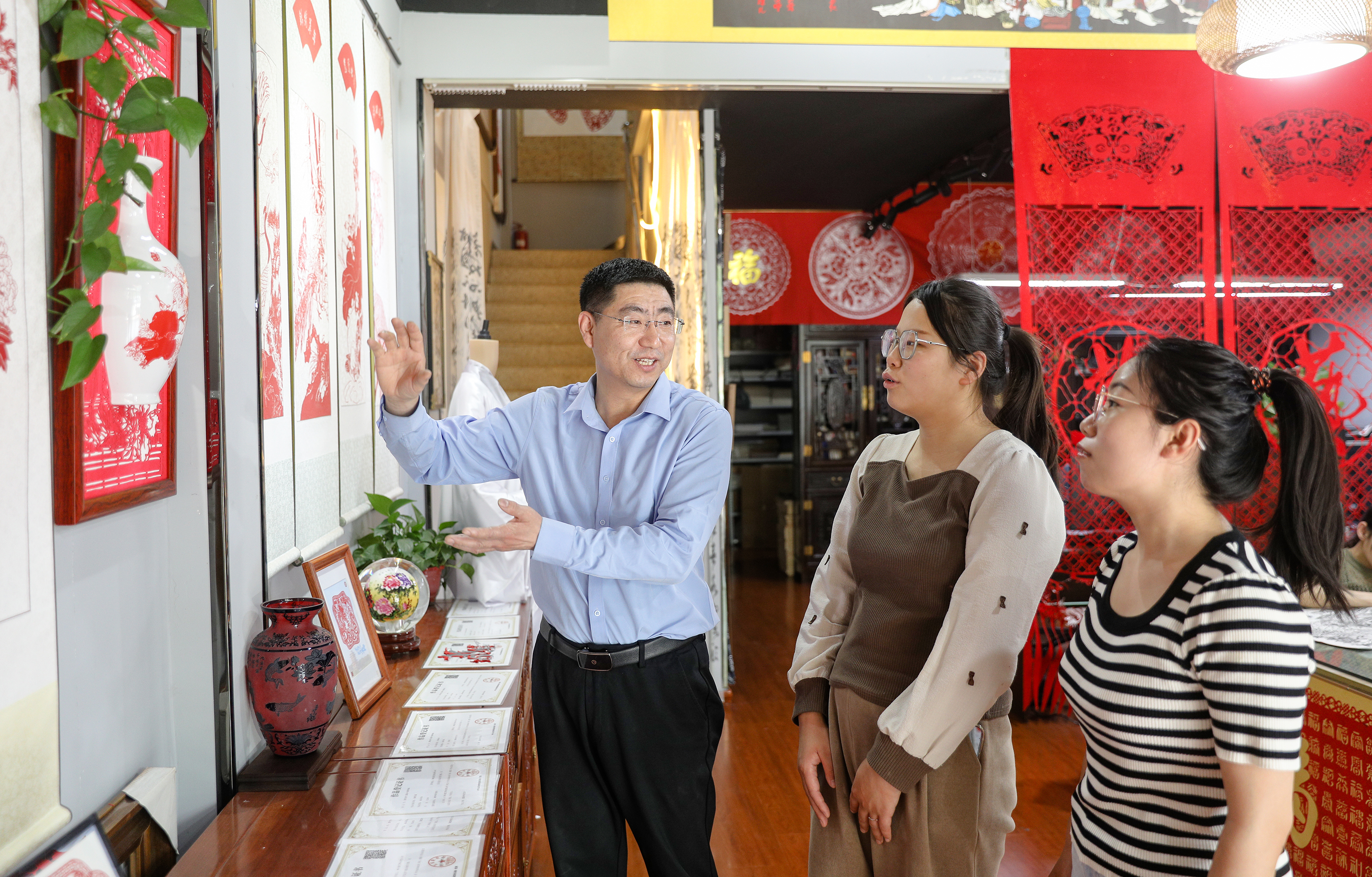 阜城剪纸艺人尤金水为群众介绍剪纸工艺品。
