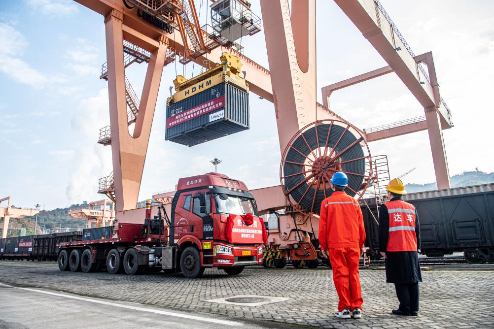 1月4日,在重庆万州新田港站,工作人员进行集装箱吊装作业,将专列货物转运至公路物流环节。新华社记者 唐奕 摄