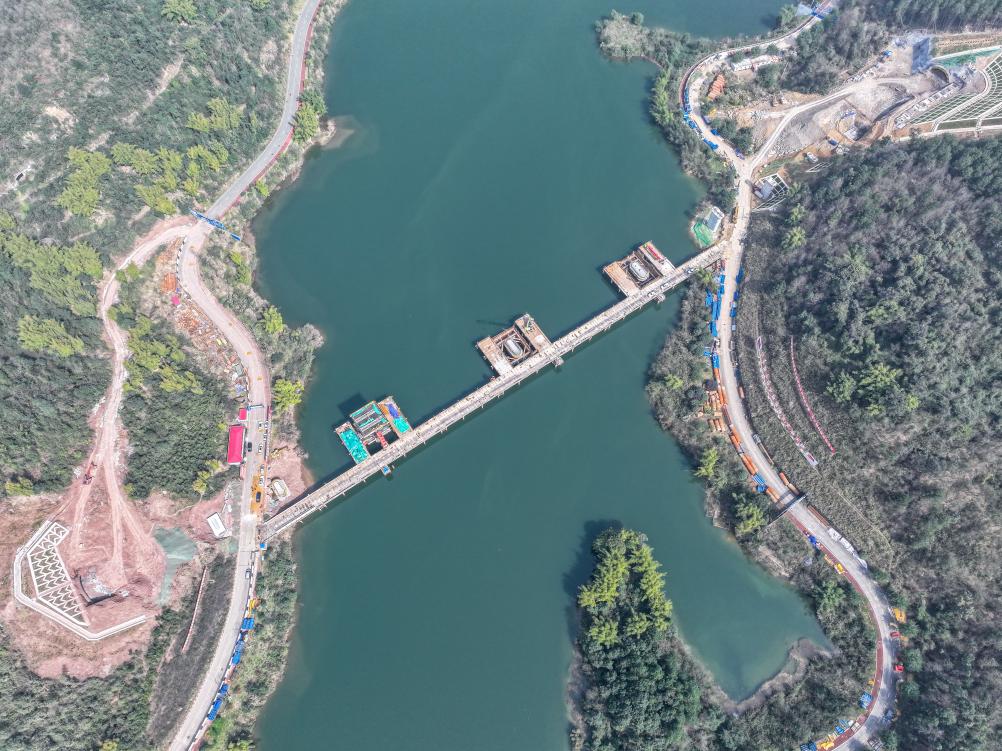 这是2月19日拍摄的位于重庆市铜梁区的成渝中线高铁玄天湖大桥建设现场(无人机照片)。新华社记者 唐奕 摄