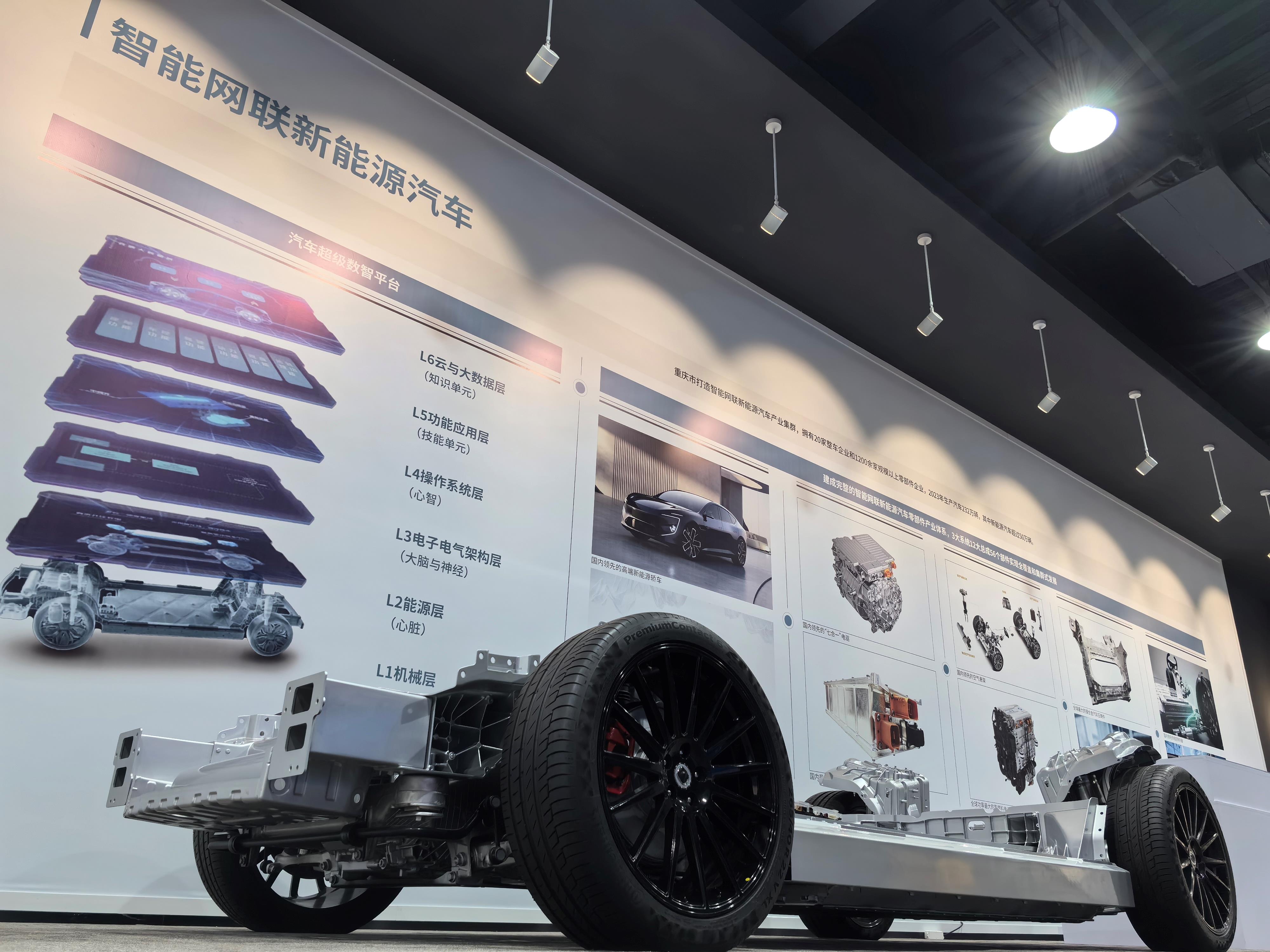 △在重庆市科技创新和产业发展成果展示上的智能网联新能源汽车部件。(总台央广记者潘毅拍摄)