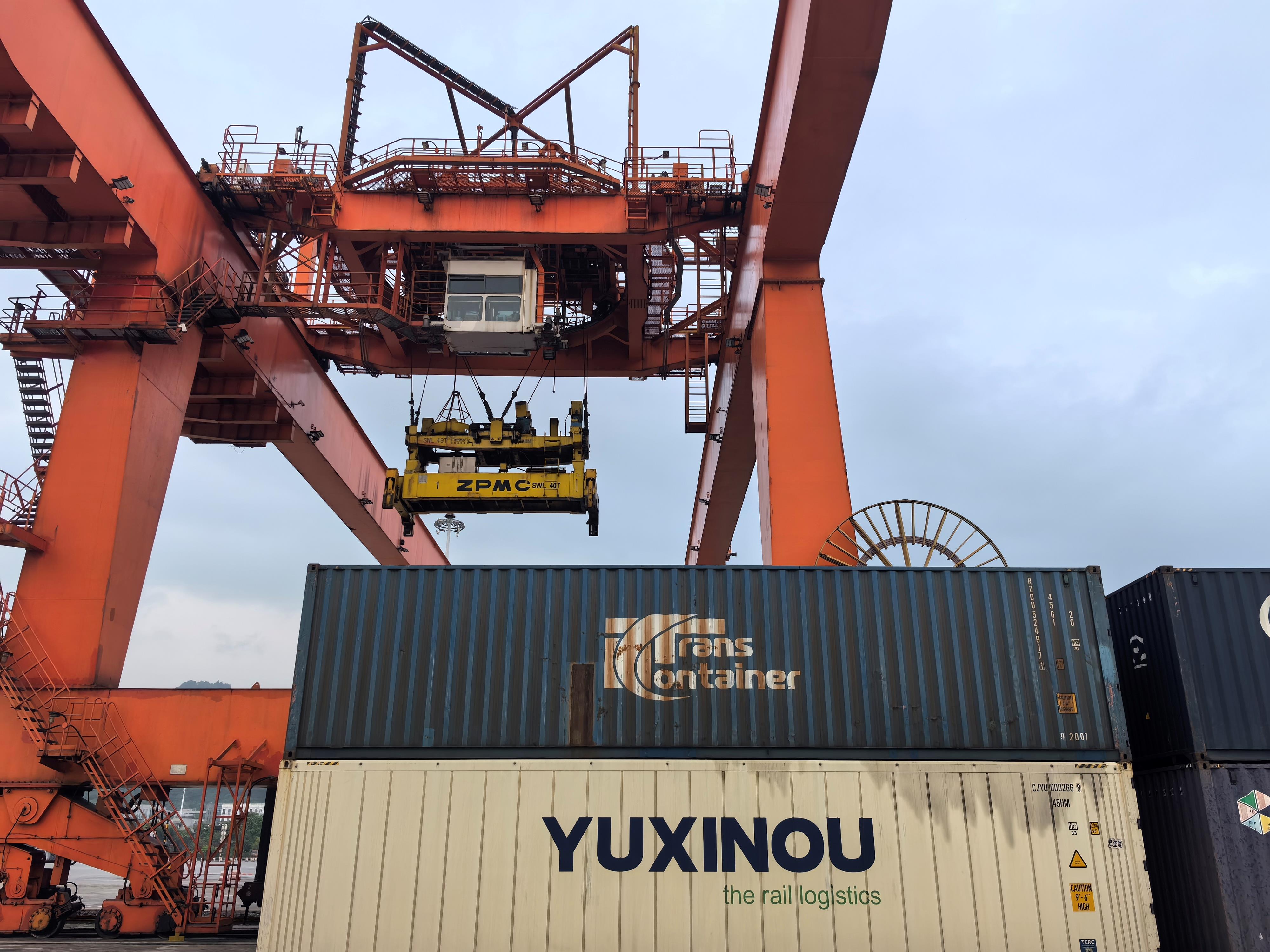 △重庆国际物流枢纽园区内,中欧班列运送的“渝新欧”集装箱整齐排列。(总台央广记者潘毅拍摄)