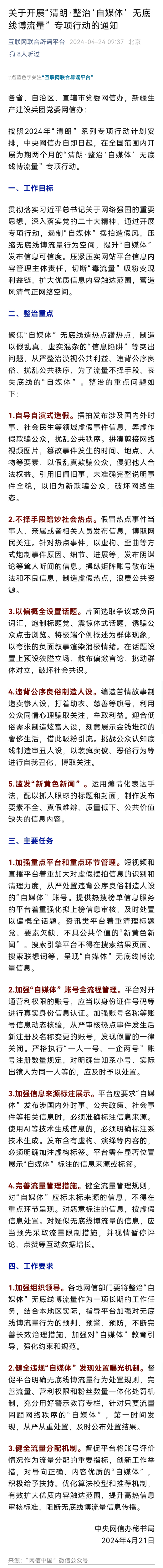 关注:中央网信办开展专项行动,整治“自媒体”无底线博流量