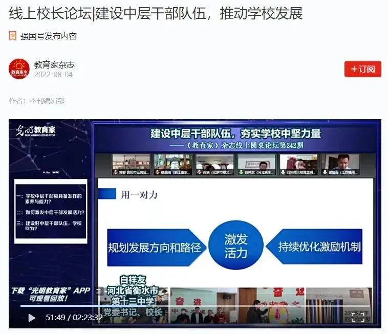 白祥友书记受邀在全市“名校长大讲堂”暨2023年中小学校长任职资格市级培训班以《办学思想研究与实践探索——以衡水十三中激潜教育为例》为题,作专题讲座,并在京津冀名师交流会上作《激潜教育的研究与探索》专题报告。白祥友书记两次被光明《教育家》杂志邀请,作《跨学科融合教学“三赋能”师资队伍建设》专题报告。在参与以“聚焦青年教师,架设成长阶梯”为主题的圆桌论坛时,白祥友主持论坛,与上海建平实验中学、江苏省无锡市新吴实验中学等六所学校的书记、校长开展交流研讨。5年来,工作室坚持“资源共享、智慧共融、互助共赢”的理念,充分发挥工作室的示范、带动和辐射作用,引领带动其他学校共同提升办学品质,推进教育事业共奋进。