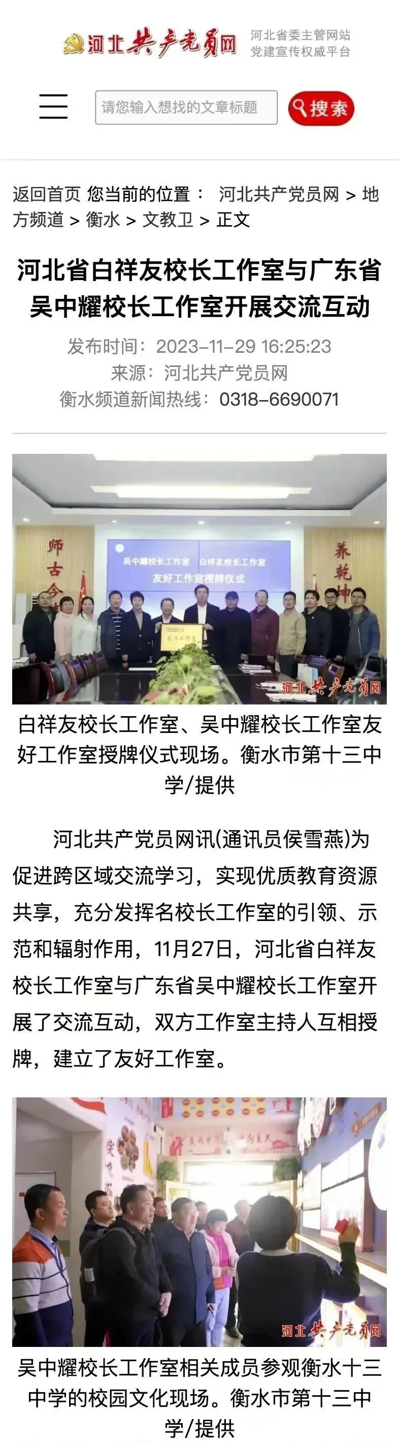 2019年4月25日,教育部“国培计划”白祥友校长工作室正式成立,邀请首都师范大学杨志成、北京育英中学于会祥等教育名家担任专家顾问;来自衡水本地、河北省内外等学校9名校长,成为工作室首批成员。