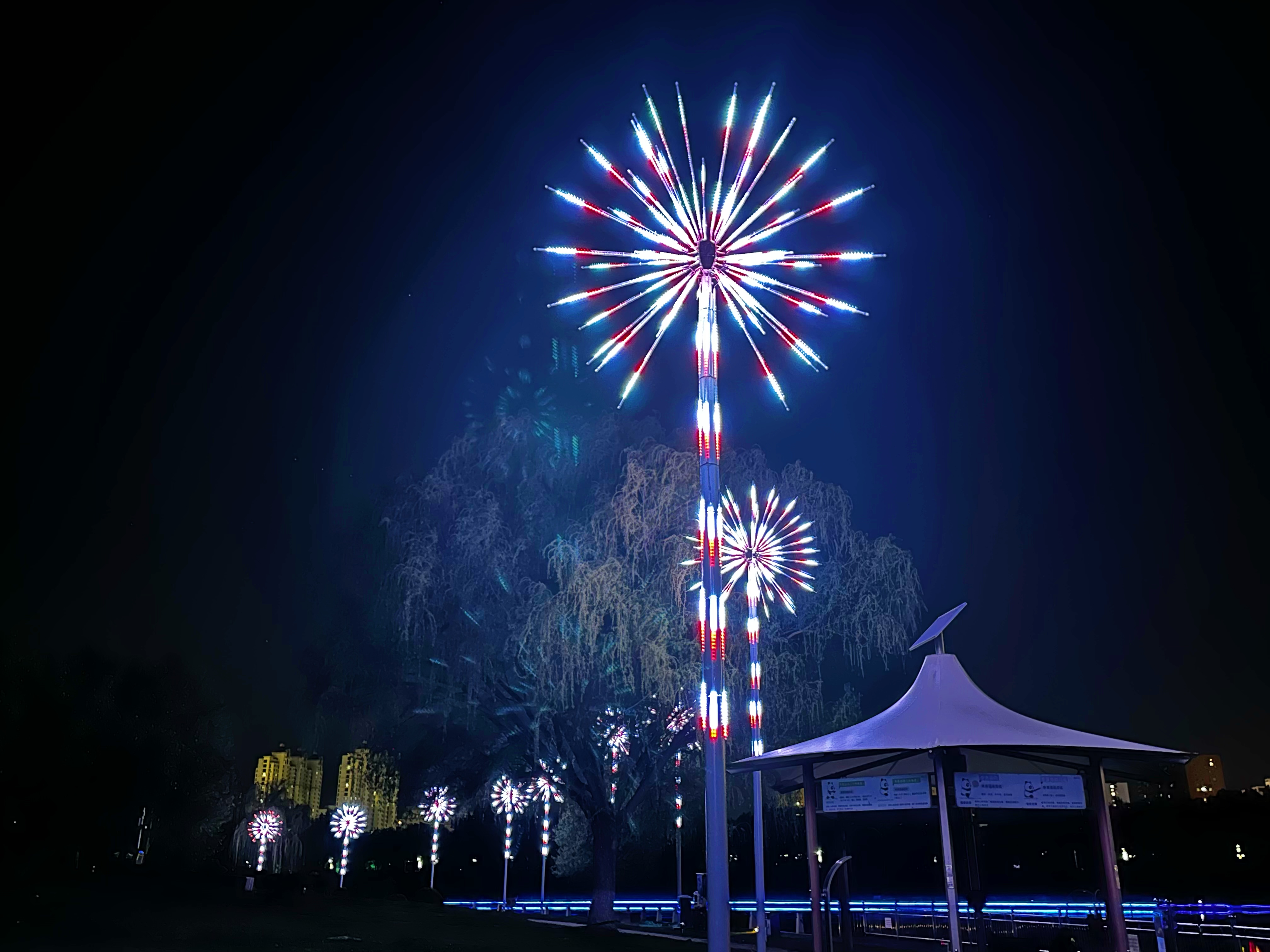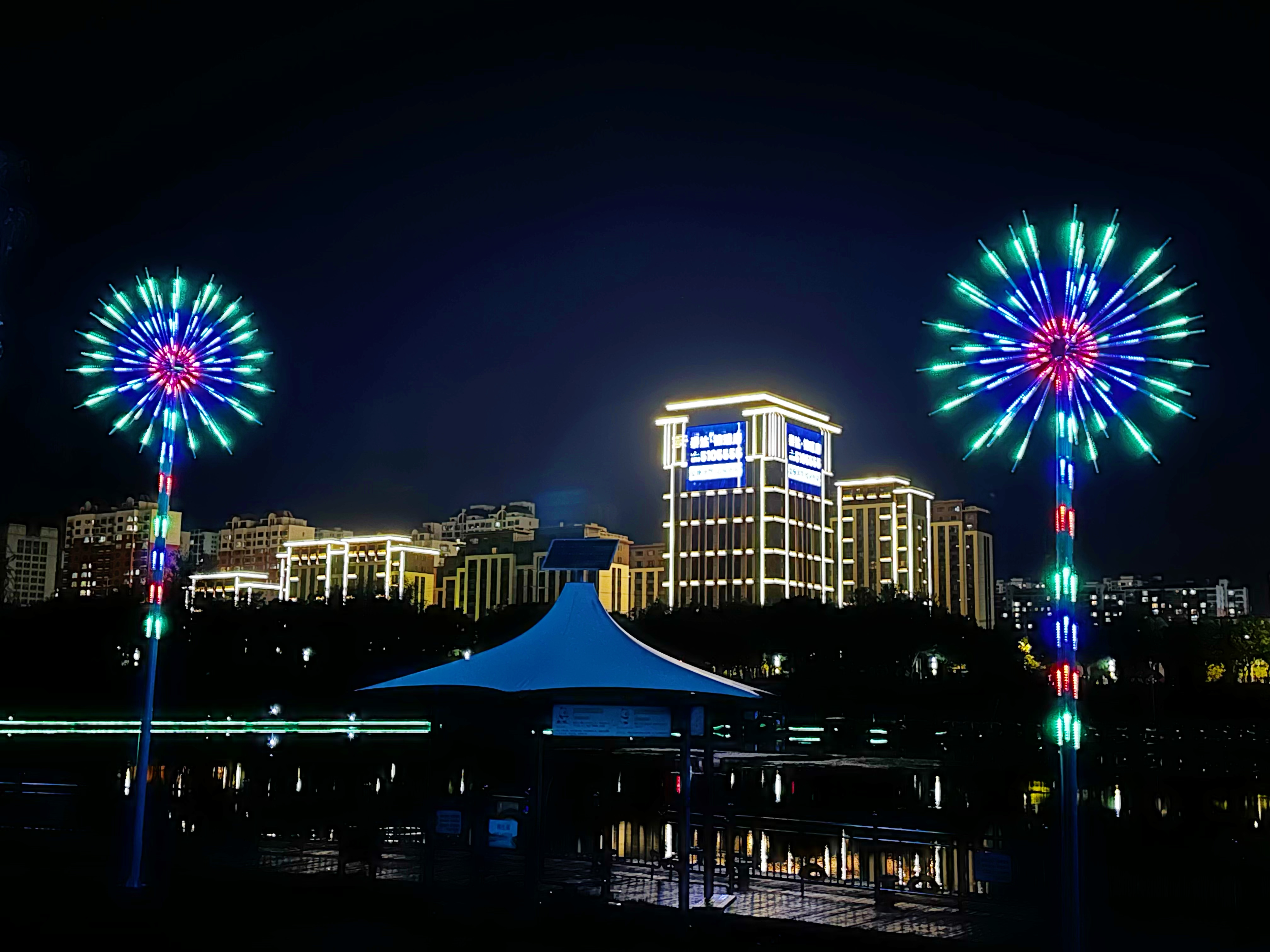LED礼花景观灯由江苏商会从江苏托运到家乡衡水,4月23日,礼花观景灯在萧何文化广场处的河南岸已全部安装完毕,景观效果明显,变幻的灯光、唯美的色彩、考究的造型,在璀璨夺目的灯光点缀下,繁华夜色为置身其中的群众增添了些许温情,有效提升了夜景品质。