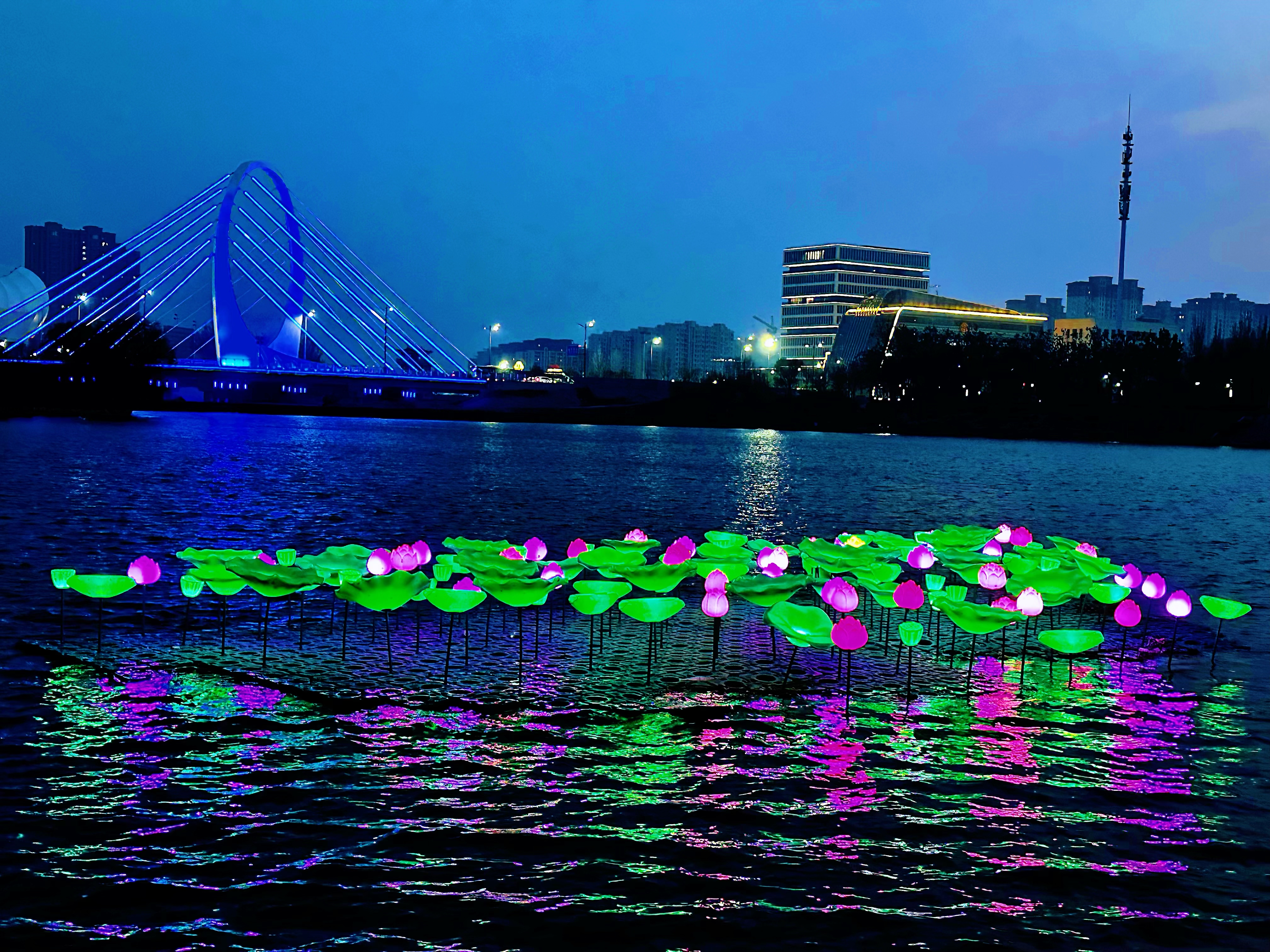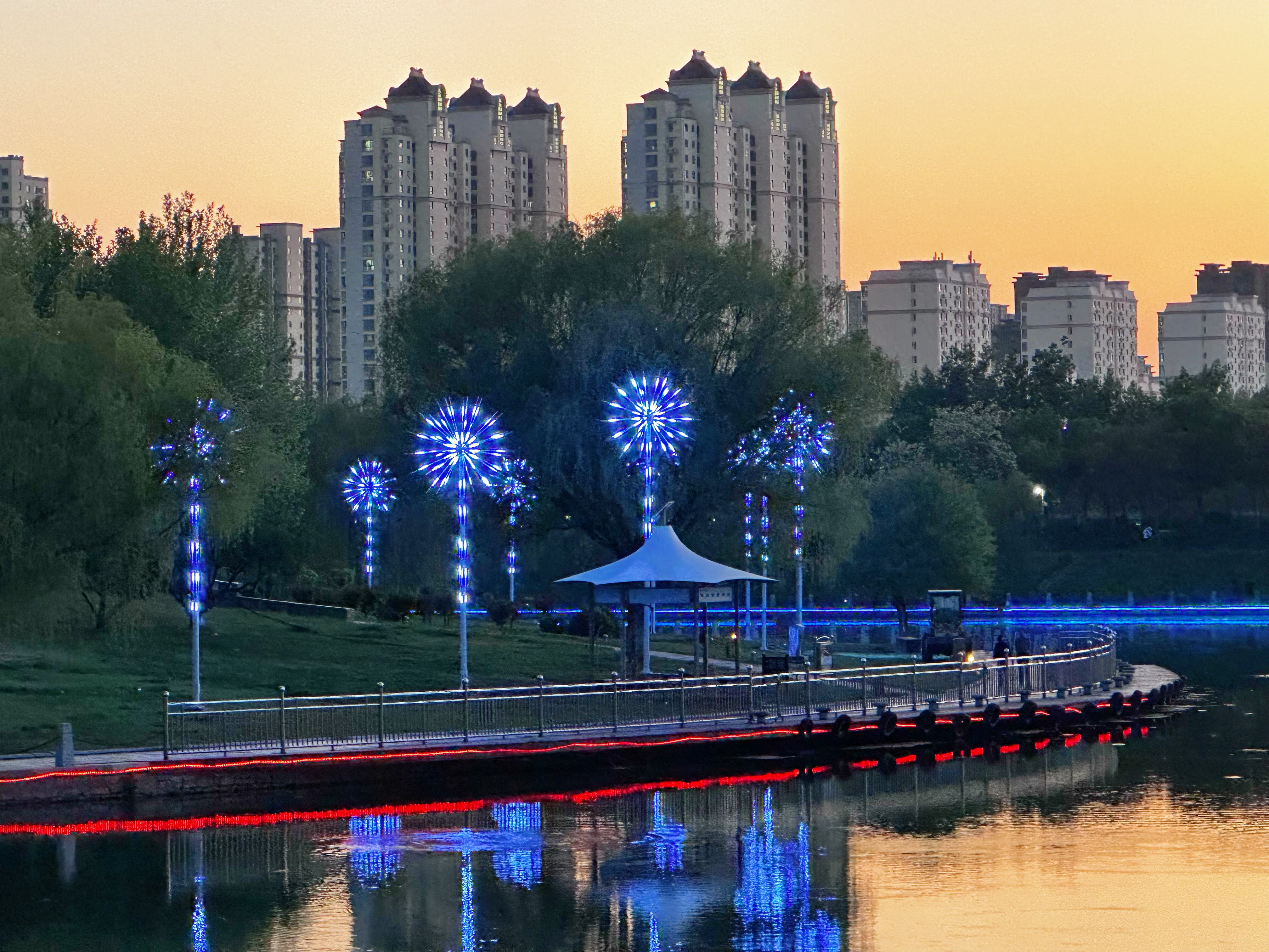 夜幕降临,衡水市区滏阳河畔,灯火璀璨,霓虹灯、景观灯流光溢彩、绚丽多姿。近日,许多市民发现,市区滏阳河风景区萧何文化广场处,新增添的礼花景观灯,格外美丽,为滏阳河文化景观带锦上添花,也成为市民傍晚休闲娱乐的新打卡地。