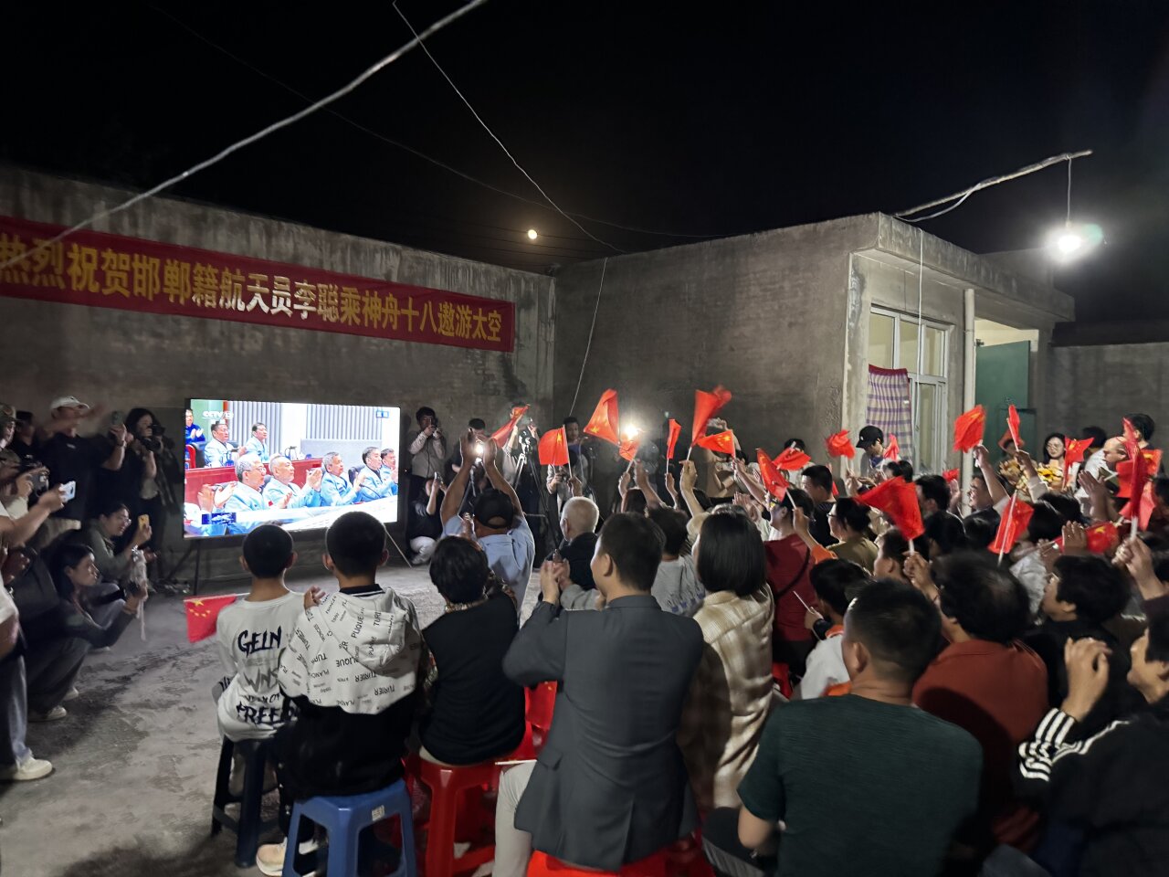 4月25日神舟十八号载人飞船发射过程直播时,李聪家的小院,被围了里三层外三层,连房顶都站上了来加油的老乡。