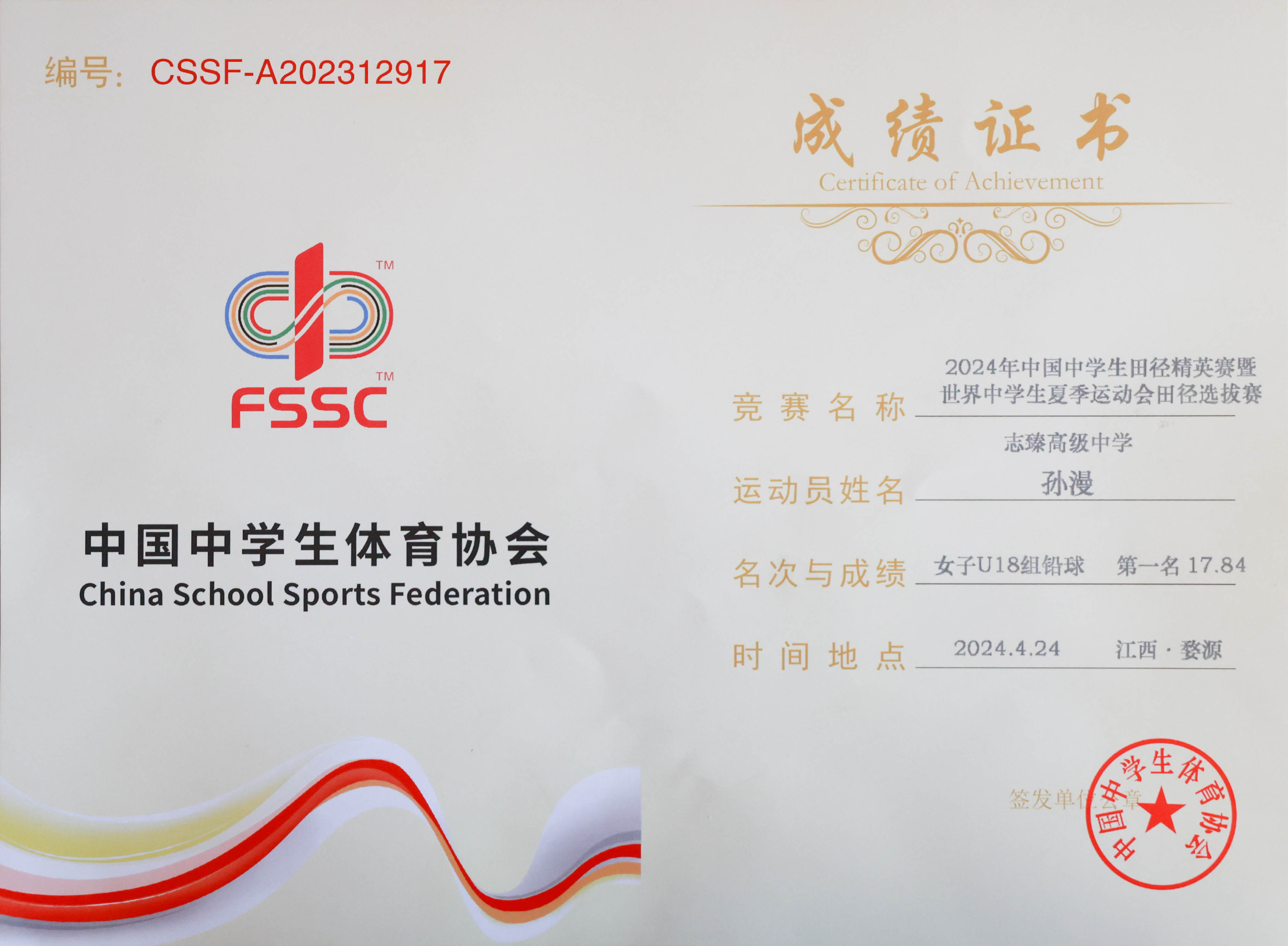 在刚刚结束的2024年中国中学生田径精英赛暨2024世界中学生夏季运动会田径选拔赛在江西省圆满收官!安平志臻中学高二年级孙漫同学与全国众多高水平选手同场竞逐,在女子铅球项目中投掷出17.84米的成绩,以绝对优势勇夺全国冠军,也是本次中国中学生精英赛河北省获得的唯一金牌,接下来会代表中国队参加2024世界中学生夏季运动会。