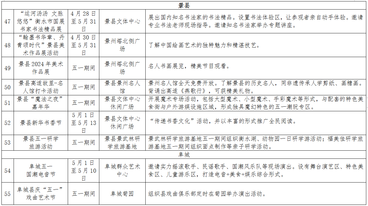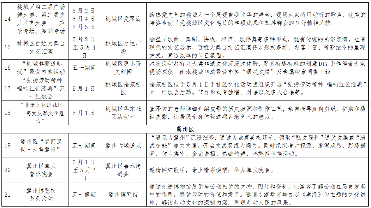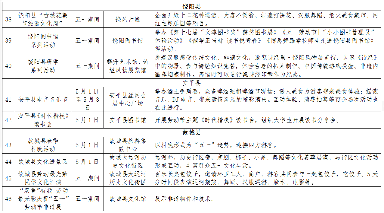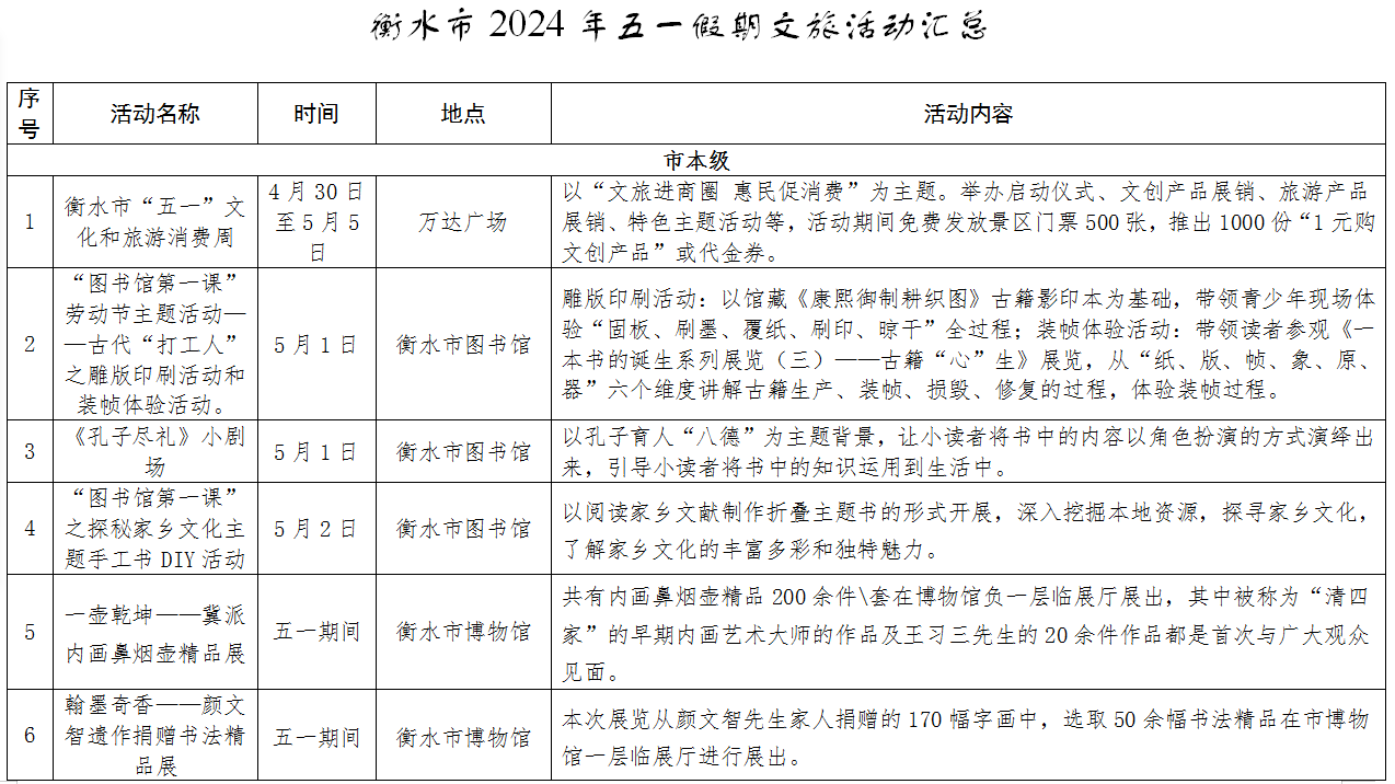 劳动节专属系列。“五一”是劳动者的专属节日,市图书馆将举办古代“打工人”之雕版印刷活动和装帧体验活动,武邑县有“庆五一”文艺汇演,故城县也将会举办劳动最光荣民俗文化汇演,为广大劳动者带来快乐休闲。