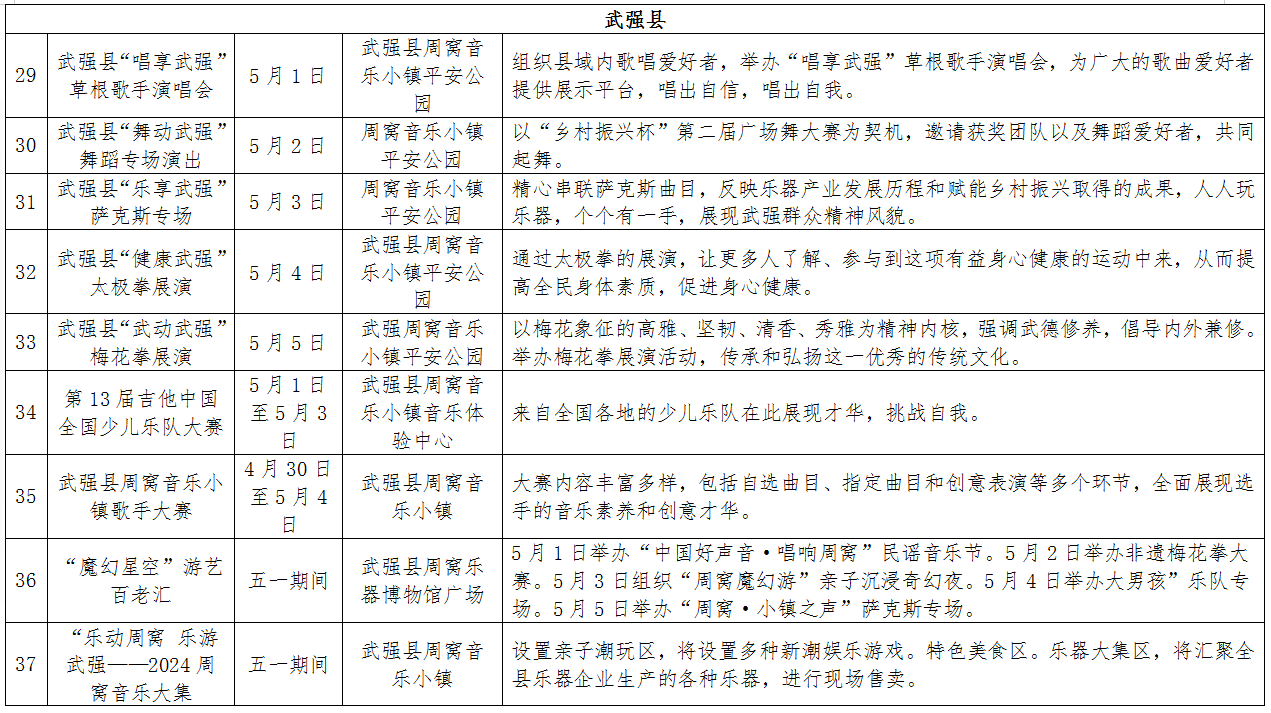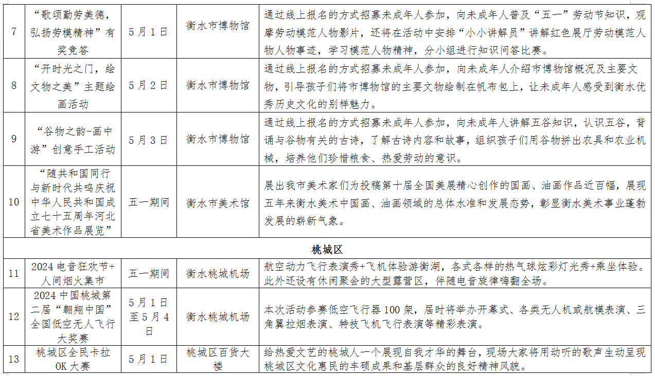 运动潮玩之旅。5月1日至5月4日,衡水桃城机场举办的2024中国桃城第二届“翱翔中国”全国低空无人飞行大奖赛,将进行各类无人机或航模表演、三角翼拉烟表演、特技飞机飞行表演等精彩表演。武强音乐小镇周窝举办的太极拳展演、梅花拳展演,放松身心的同时还能强身健体。