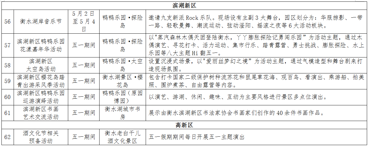 音乐律动之旅。在衡水湖畔的鸭鸭乐园探险岛将举办衡水湖岸音乐节,邀请九支新派Rock乐队为乐迷表演。在衡水湖碧水湾码头将举办冀州区篝火音乐晚会,为广大乐迷带来不一样的体验。武强音乐小镇周窝有草根歌手演唱会、萨克斯专场、“魔幻星空”游艺百老汇、音乐大集等活动轮番上演,一场音乐饕餮大餐摆在乐迷面前。