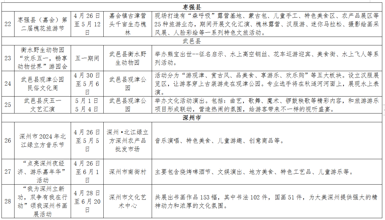 有氧呼吸之旅。滨湖新区将举办樱花岛踏青出游采风季活动,游客可以打卡国家二级保护树种流苏花和鼠尾草花海、观百鸟、看演出、乘游船、拍美照、围炉煮茶、自由露营。枣强县(嘉会)第二届槐花旅游节正在举办,游客可以体验“森呼吸”露营基地、蒙古包、儿童手工、特色美食区、农产品展区等25种旅游业态。