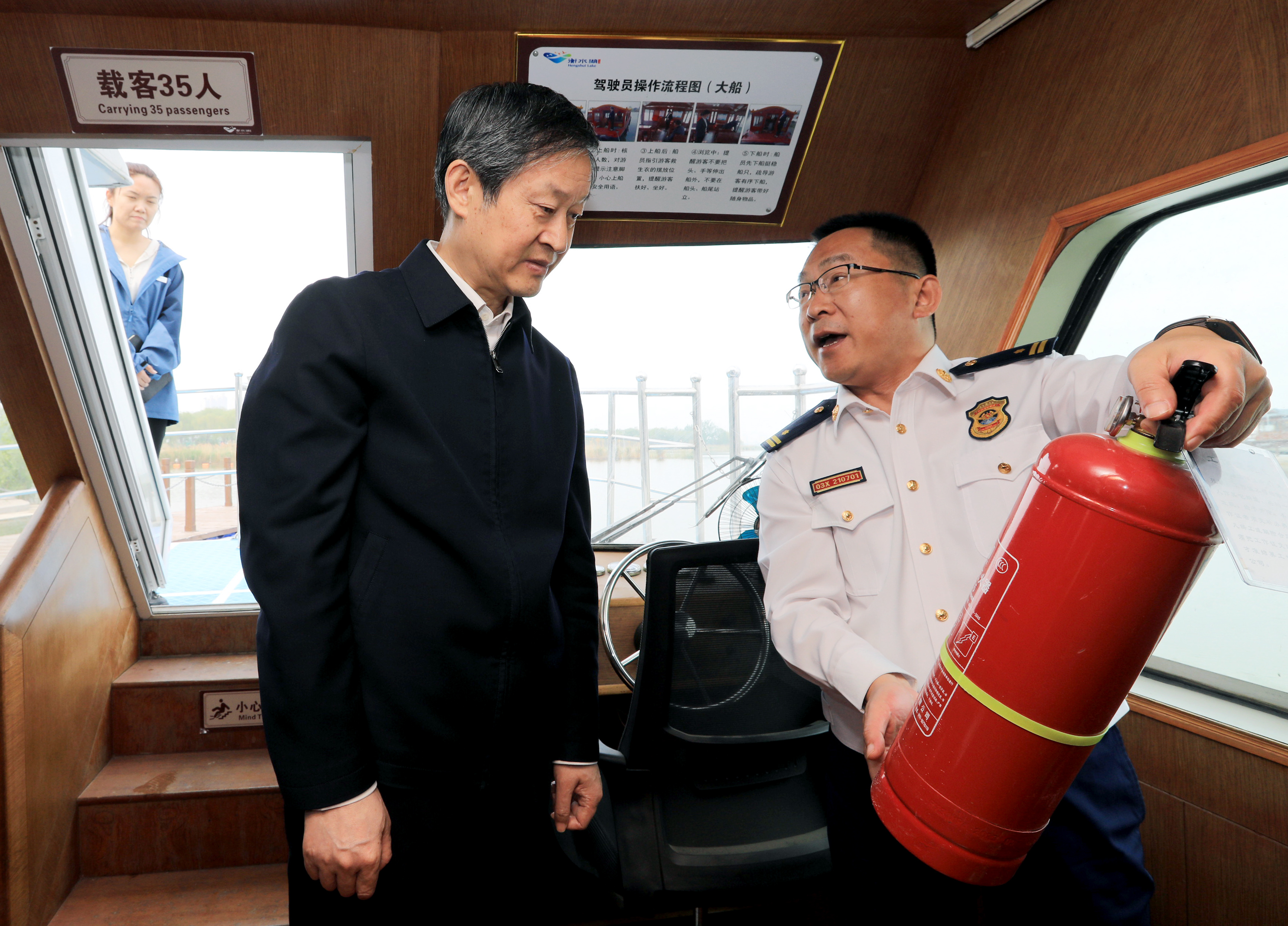 随后,吴晓华来到冀州区碧水湾码头,检查景区消防设施配备和游船安全情况。他说,随着“五一”假期来临,景区将迎来人流客流高峰。要高度重视游船运营安全,完善应急预案,加强灭火器、救生衣、救生艇等救援设备和专业救援队伍配备,做好极端天气防范应对工作。各级各部门要加强安全监管,对旅游船艇开展拉网式排查,落实各项安全防范措施,为广大游客营造放心、安心、舒心的旅游环境,让大家乘兴而来、满意而归。