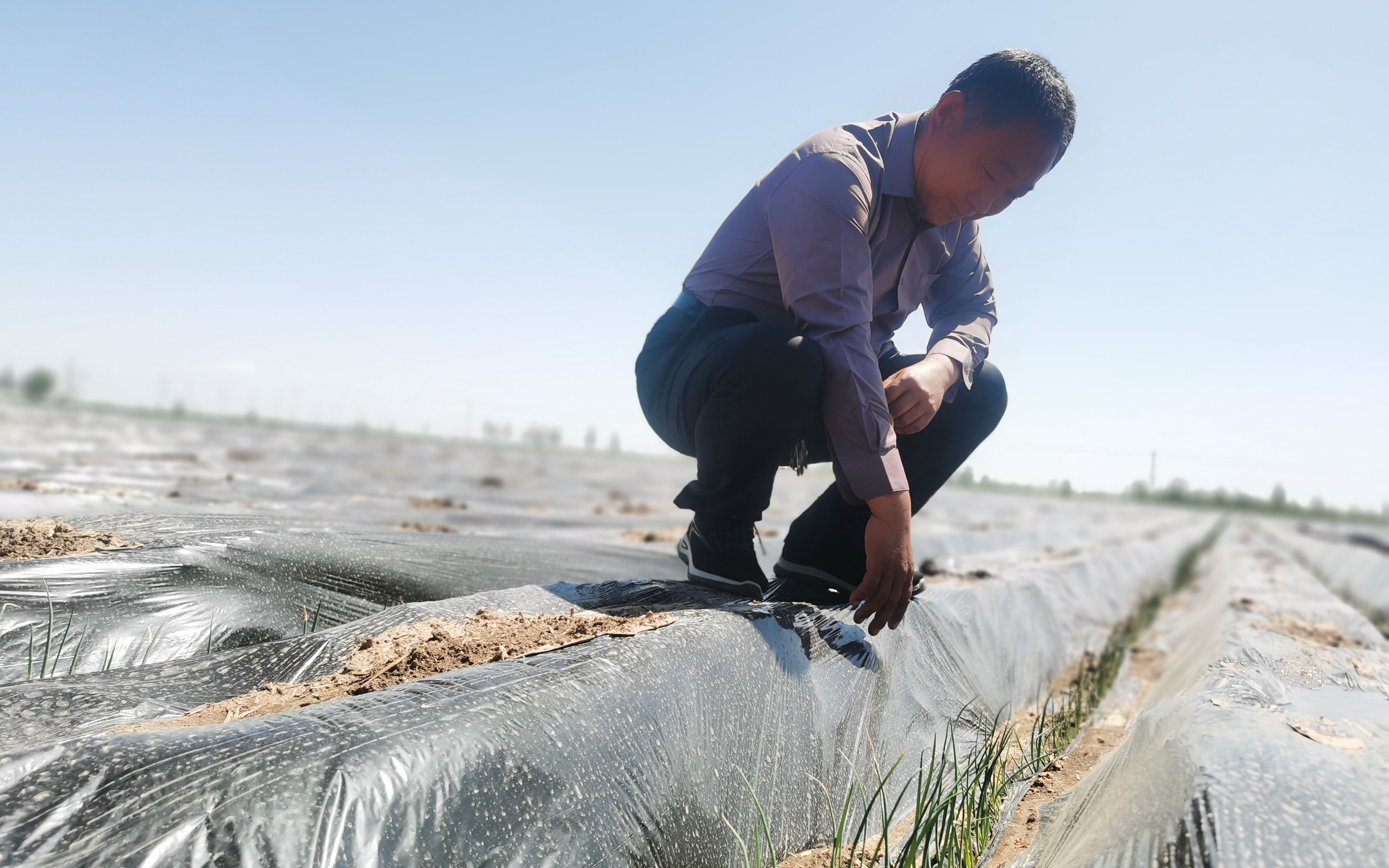 在冀州区门家庄乡广袤的麦田间,有一片与众不同的庄稼地:远远望去,黑色地膜闪闪发光,如璀璨星河;走进细看,黑色地膜覆盖的地垄间一排排破土而出的小葱苗生机盎然,孕育希望。