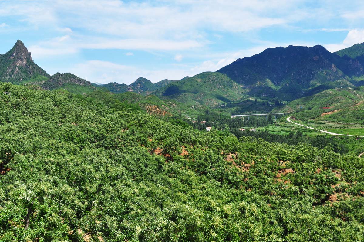 宽城地形以山地为主,农民根据不同地段自然条件的差异,将板栗林与其他各种植被类型,如油松林、农田等进行合理搭配,构成了独具特色的山地景观。