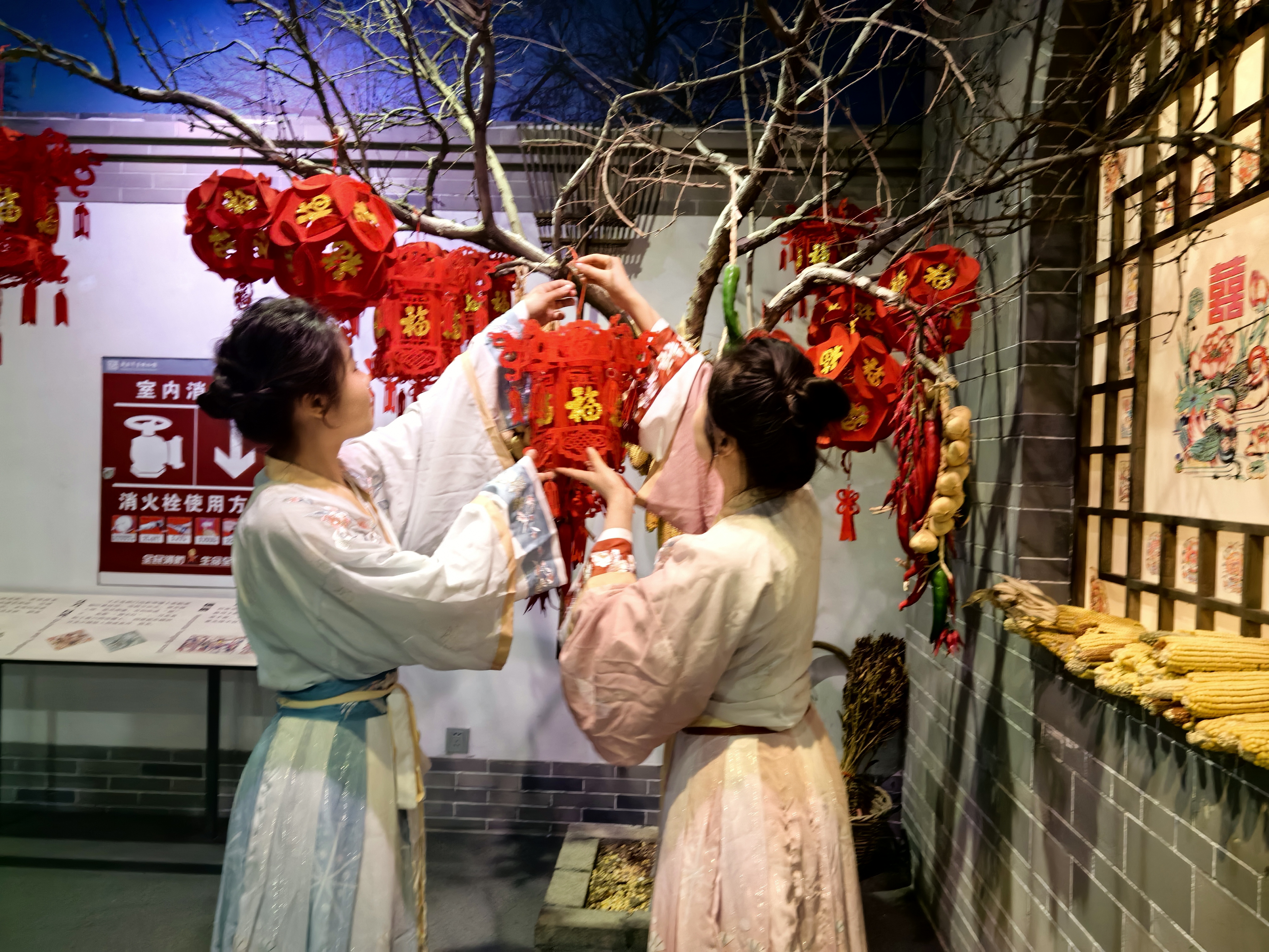 穿梭着博物馆各个景点,白墙灰瓦的映衬下,身着汉服的游客们古典端庄,秀美典雅。他们通过中华衣冠的展示,传播中国传统服饰文化,在普及汉服知识的过程中感受武强年画这一非遗文化的魅力。
