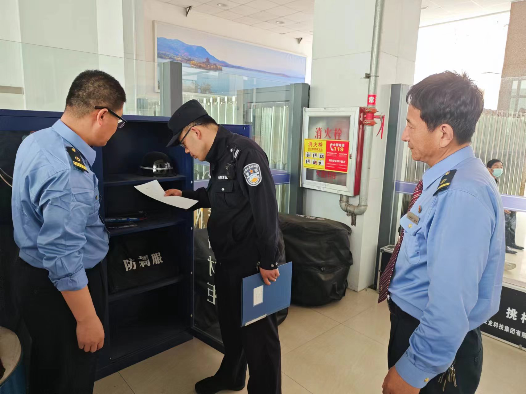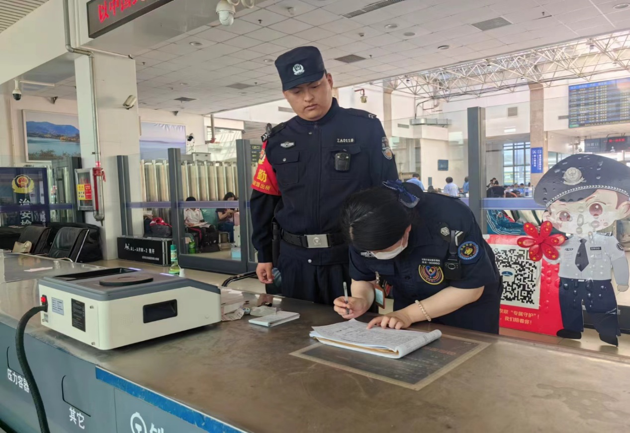 5月1日,值班民警对衡水火车站进站安检工作情况进行检查。