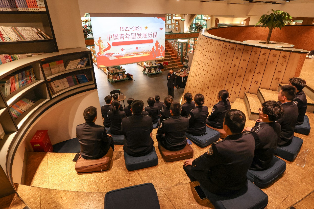 2024年4月28日, 20余名共青团员来到书店参加“讲团史、唱团歌、聚团魂”主题团日活动,石家庄铁路公安处团委副书记王君慧带领大家从共青团的诞生、发展、辉煌三个阶段深入了解了中国共产主义共青团的历史和“五四”精神,并重温入团誓词、唱响《中国共产主义青年团团歌》。