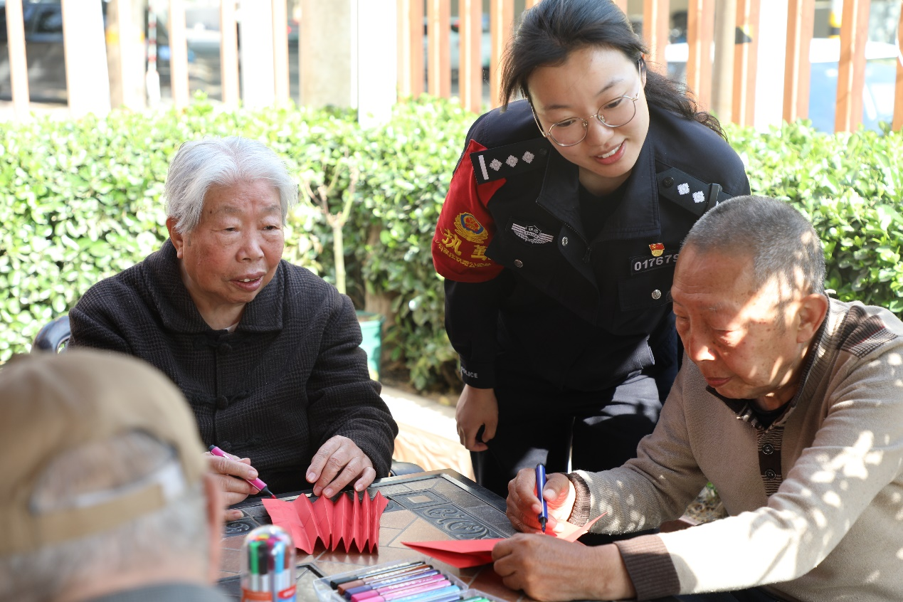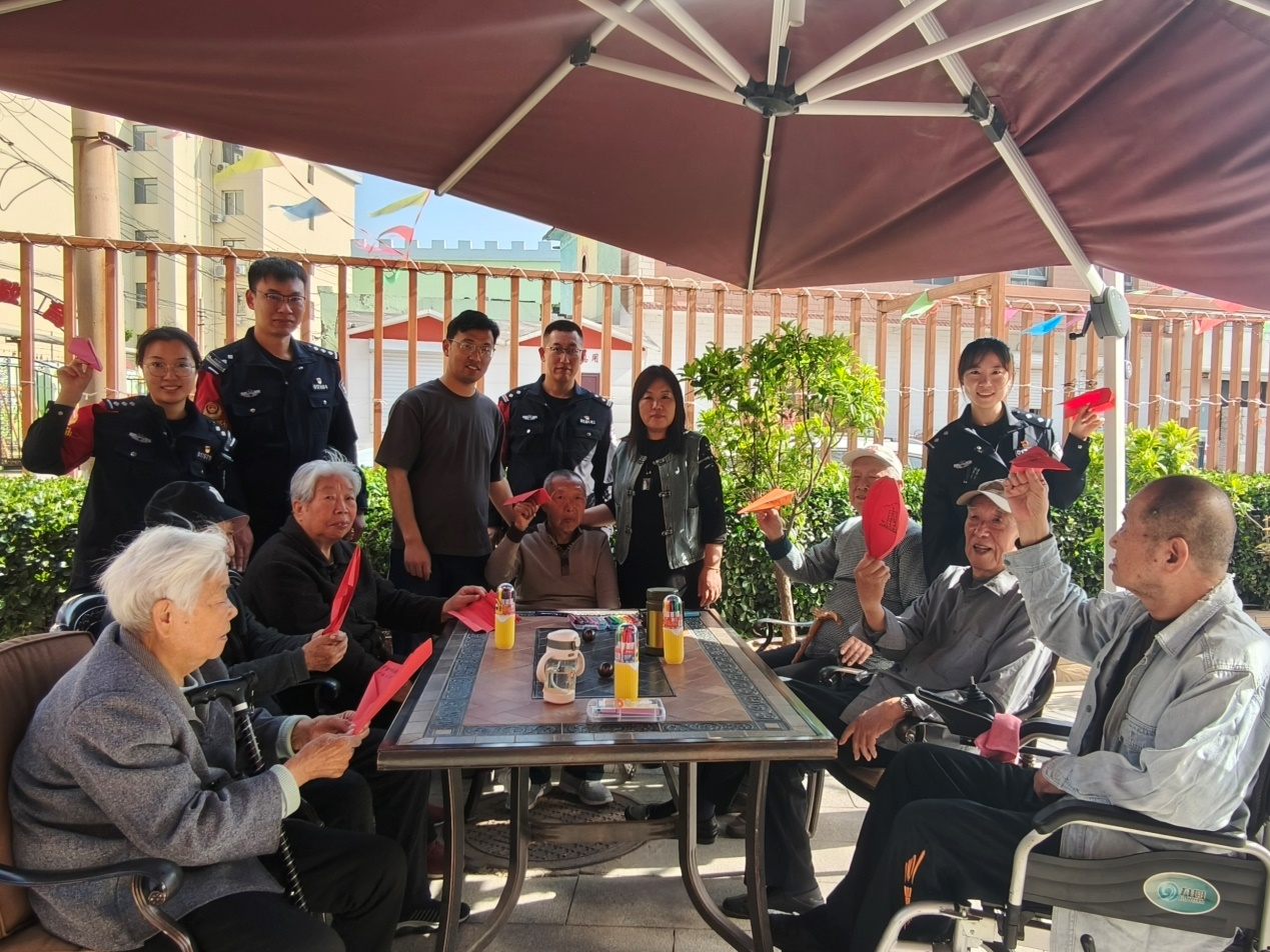 石家庄北站派出所青年民警到养老院与老人们一起唱红歌、做手工折纸、为老人们送去关怀和温暖。