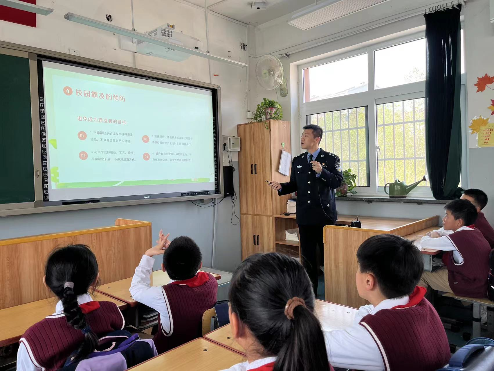 石家庄站派出所青年民警到学校开展法制宣传活动,为小学生普及反校园霸凌等安全常识。