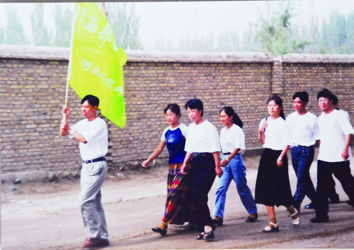2000年8月,丁建新举着“到西部教书去”的旗帜,一行15名支教毕业生到达且末